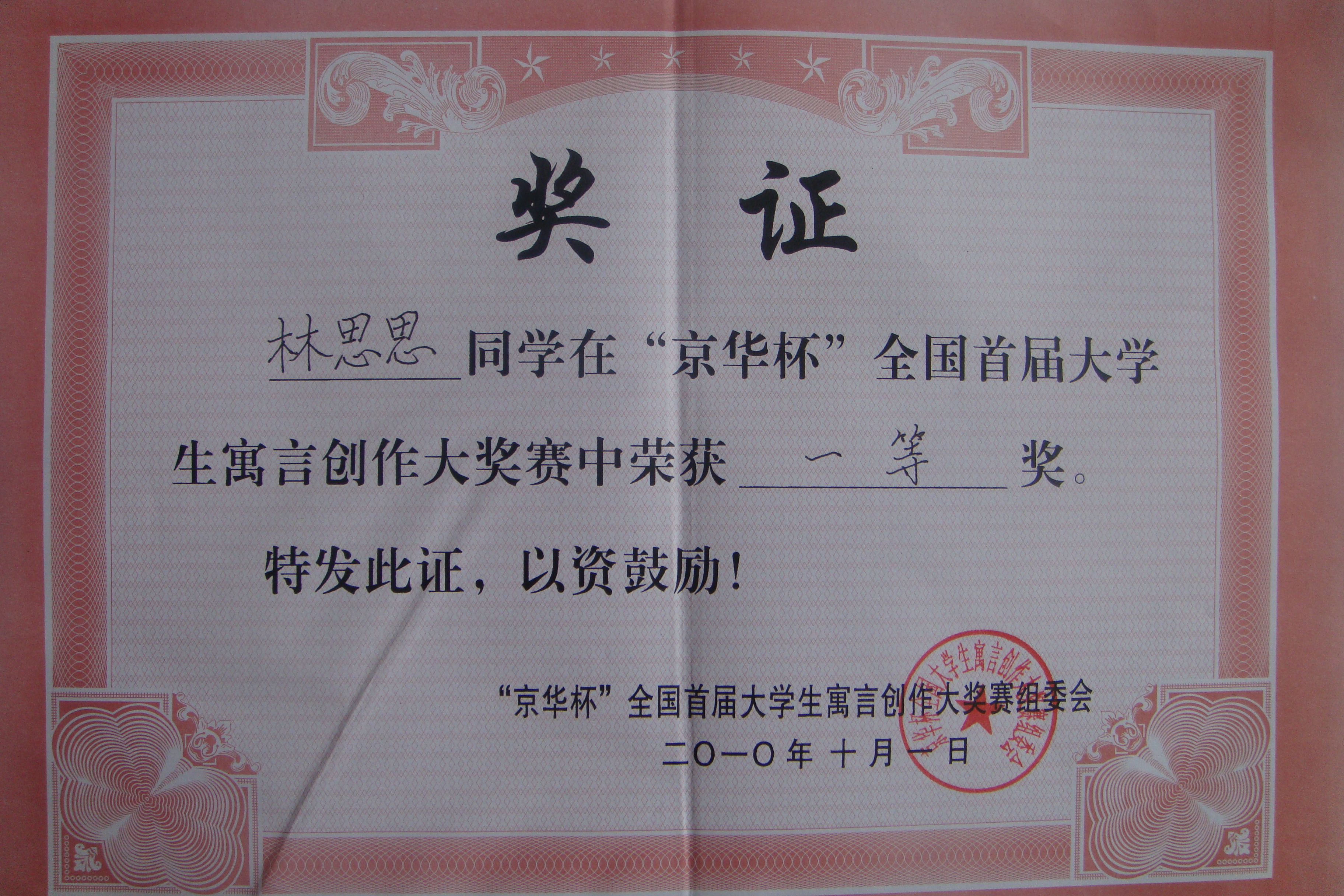 在9月30日上午刚刚闭幕的“京华杯”全国首届大学生寓言赛颁奖会上,我院08小教本二的林思思同学凭寓言作品《一墙之隔》从600余篇参赛作品中脱颖而出,一举夺魁,成为此次大赛唯一的一等奖得主。