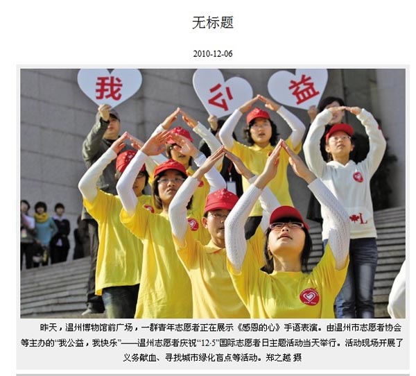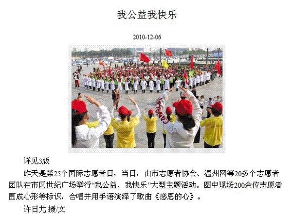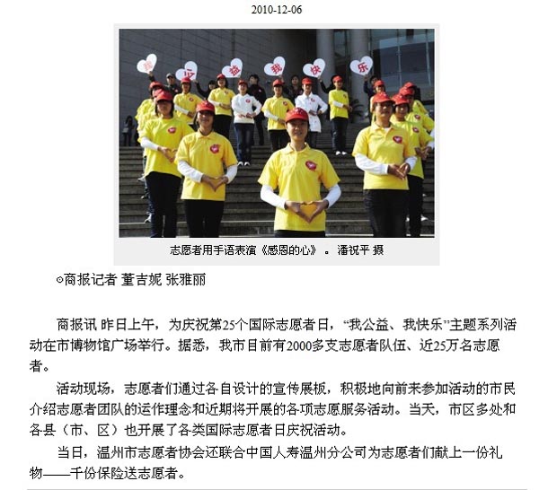 12月5日是国际志愿者日,秉承着“我公益,我快乐”的志愿服务精神,由温州市志愿者协会、温州网主办的“我公益,我快乐”志愿者主题活动在市区世纪广场隆重举行。本次主题活动内容包括“志愿者演出活动”、“现场无偿献血”、“爱心图书室图书募捐”“趣味运动会”等,来自全市20多个志愿者团队参加了此次活动。凭着优秀的表现,我院青年志愿者获得了温州日报、温州都市报、温州商报等相关媒体的报道。