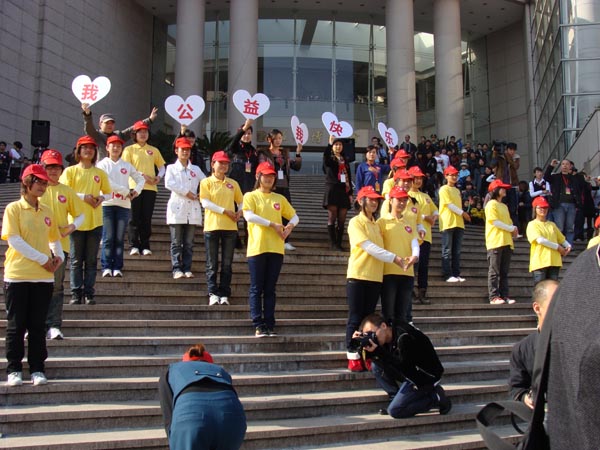 当天上午9:30,志愿者演出准时开始。在优美的诗歌朗诵,庄重的志愿者宣誓及精彩迭出的街舞表演过后,我院手语协会的志愿者登场表演,随着《感恩的心》音乐响起,他们成心型队伍排列,带领着全场的志愿者做歌词手语。他们饱满的精神,灿烂的微笑,标准整齐的手语,感染着每一个人,成为世纪广场上一道亮丽的风景线。当音乐结束,全体志愿者手拉手,齐声高呼“我公益,我快乐”,将整个活动推向了高潮。