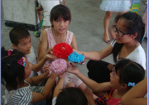 下午2点,队员们给小朋友们上了名著解读课。在播放电影《夏洛特的网》之前,队员们将该影片做了简单的介绍,让孩子们在视觉享受中学到知识。4点,实践队给孩子们上了手工课。孩子们十分热情,老师把孩子们分成6组,每组6人,每个小老师带着一队孩子。孩子们在主讲老师的引导下一步一步的将纸牡丹花做好。当孩子们手里拿着自己的劳动成果时,他们紧皱的脸顿时绽开了灿烂的笑。