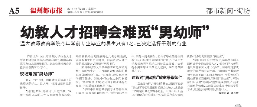 幼教人才招聘会难觅“男幼师”温大williamhill官网今年学前专业毕业的男生只有1名,已决定选择干别的行业2011-04-25