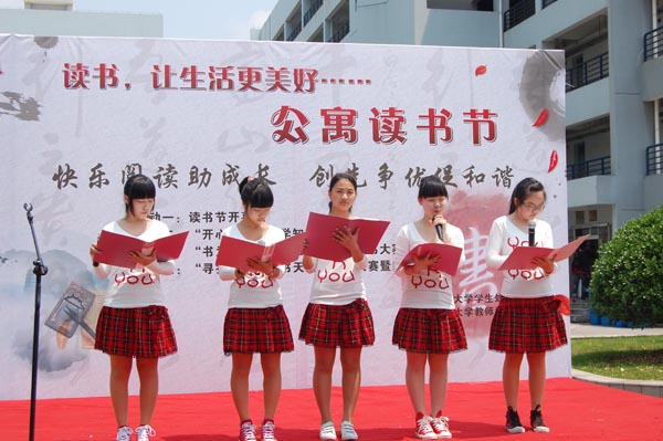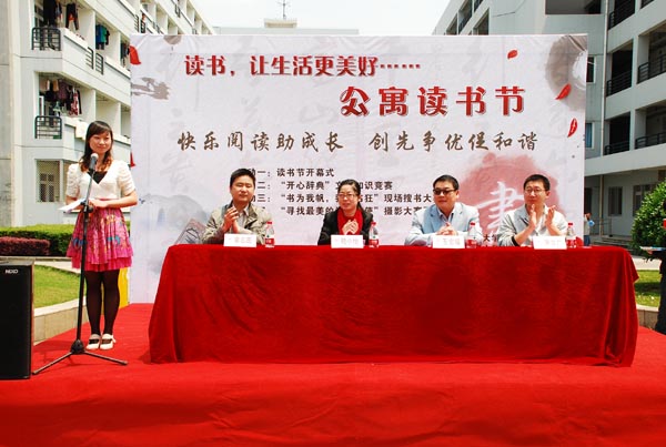 书是人类进步的阶梯,阅读一本好书,能够丰富我们的知识,陶冶我们的情操,启迪我们的智慧。“世界读书日”前夕,为培养大学生良好的阅读习惯,推进学院学风建设工作,我院举办为期1个月的以“快乐阅读助成长,创先争优促和谐”为主题开展公寓读书节活动。4月21日中午,公寓读书节开幕式在公寓C区隆重举行。学生处处长王定福、院党总支副书记嵇小怡、院学生科长章志图、学生处老师涂立广及各学院辅导员老师出席了开幕式。上百名学生参加了开幕式。