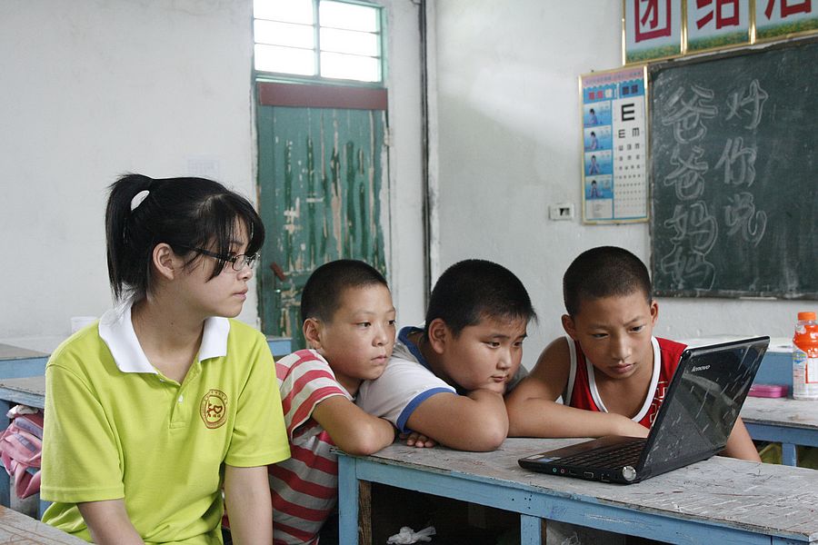 上午8:00——8:40,是老师们为学生暑期作业辅导时间。伴随着下课的铃声的响起,大班同学显得异常的兴奋和高兴。因为接下的两节课将会欣赏一部感人肺腑、启迪灵魂的电影­­­--《暖春》。但是我们的实践地龙湾区培英学校的教学设施非常简陋,每间教室没有电视、没有多媒体,只有破旧的桌椅和两个老式的电风扇。为了能够让所有的学生都能看上这部优秀的电影《暖春》,我们决定将实践队里五台笔记本下载好电影,带到教室来和学生一起看这部电影。平均六个人一台笔记本电脑,虽然六个人一起看电影会很挤而且笔记本的声音也不是很大,但是同学们都聚精会神地用心来欣赏这部优秀电影。
