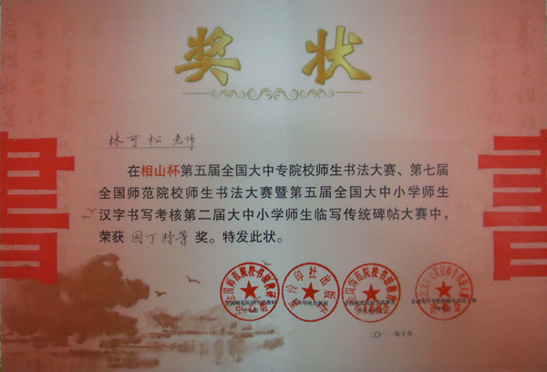 11月15日,“相山杯”第五届全国大中专院校师生书法大赛、第七届全国师范院校师生书法大赛暨第五届全国大中小学师生汉字书写考核大赛颁奖大会在安徽淮北隆重举行,我院09小教本学生徐文康、张凯莉、陈称心荣获特等奖;指导老师林可松获“园丁特等奖”;William威廉荣获“团体特等奖”。特此报喜!