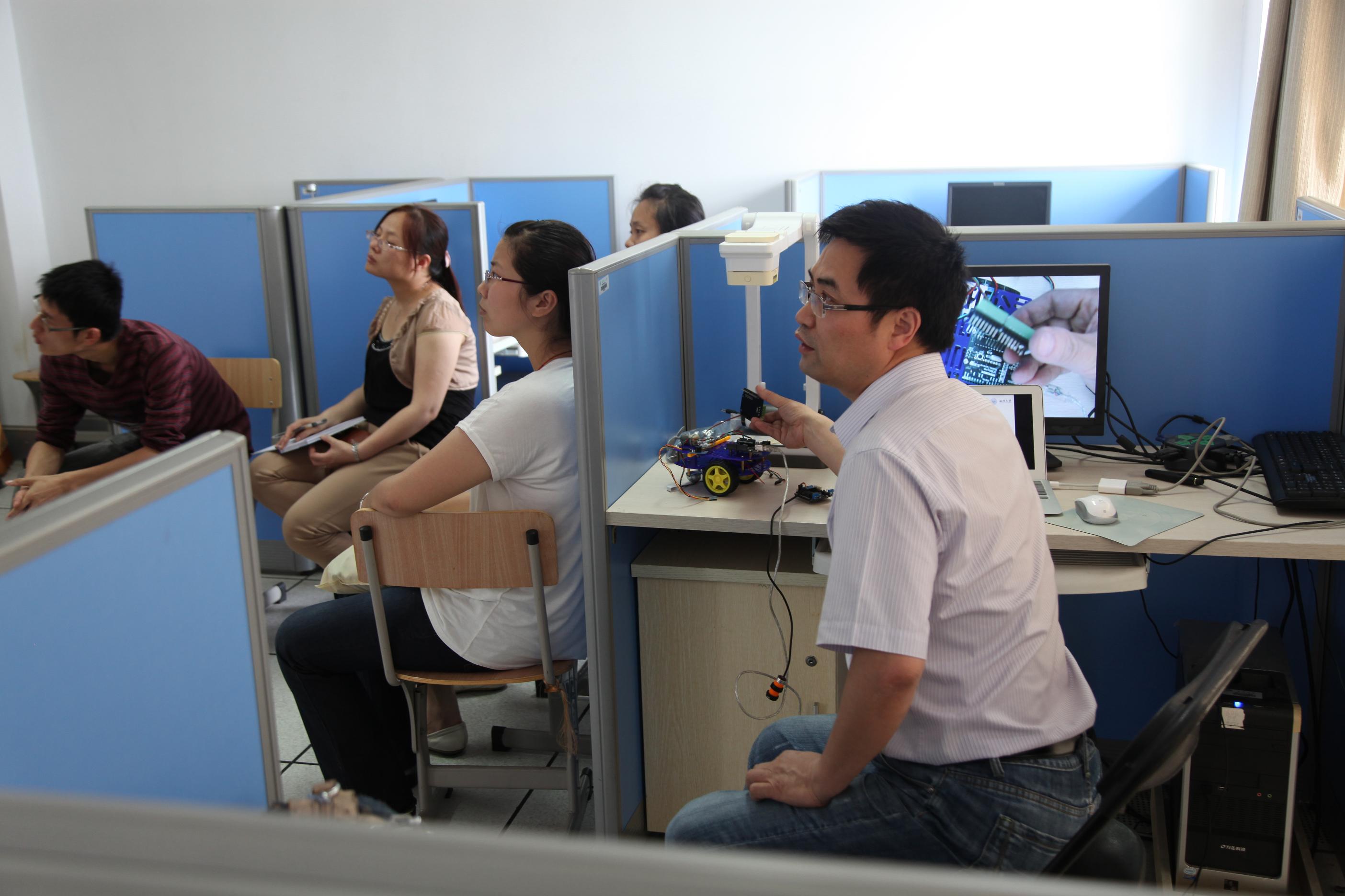 在近2多小时的深入研讨过程中,参与的教师以及部分研究生都一致认为,“机器人技术综合了机械、电子技术、信息技术、自动控制、人工智能等多学科的发展成果,代表了高技术的发展前沿。学生通过机器人活动实践,可以进行计算机编程、工程设计、动手制作与技术构建,结合学生的日常观察、积累,寻求自己最完美的解决问题的方案,同时对发展创造力,促进素质教育、提高学生的科技素质,具有积极的意义。”(通讯员杨刚 摄影 黎启龙)