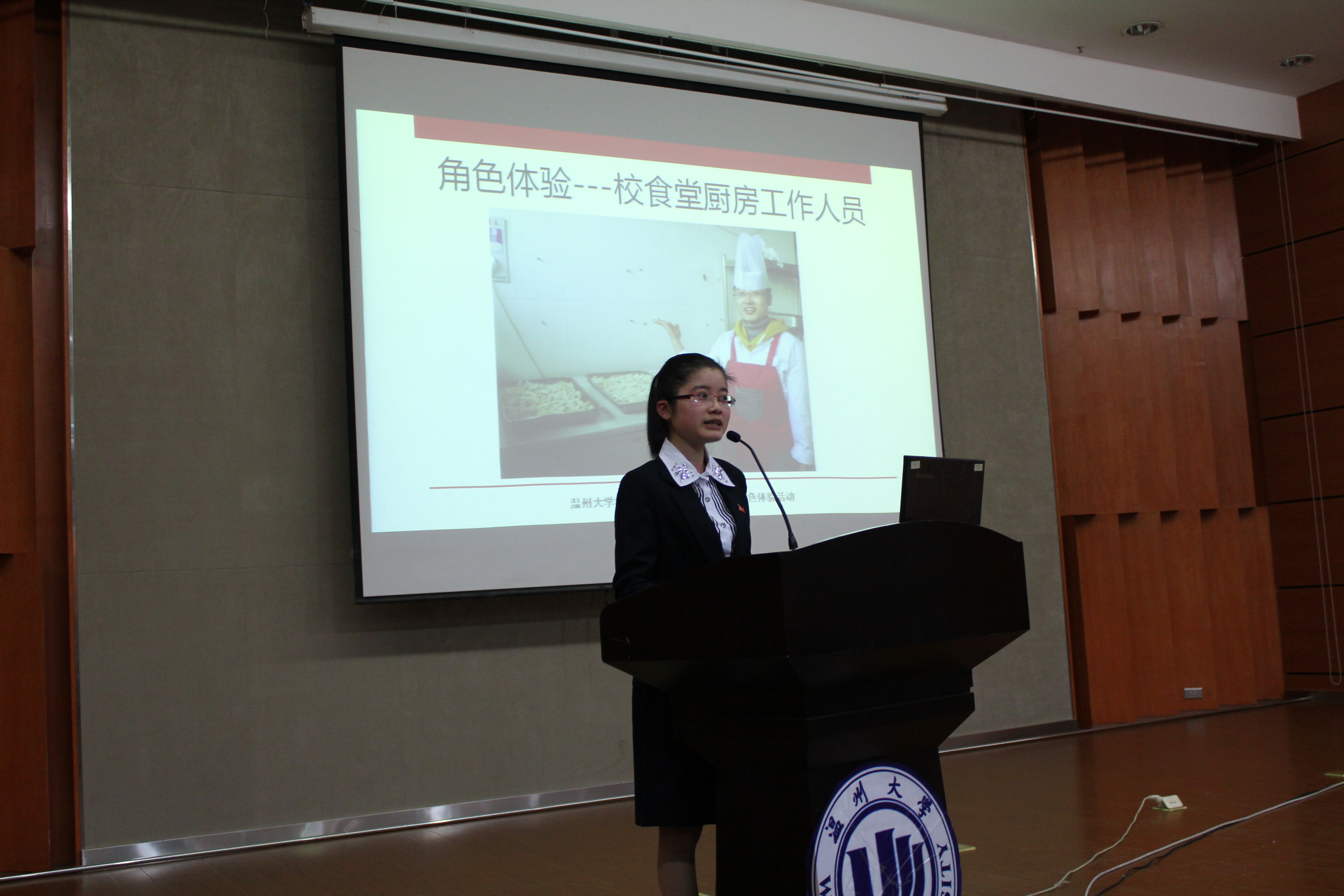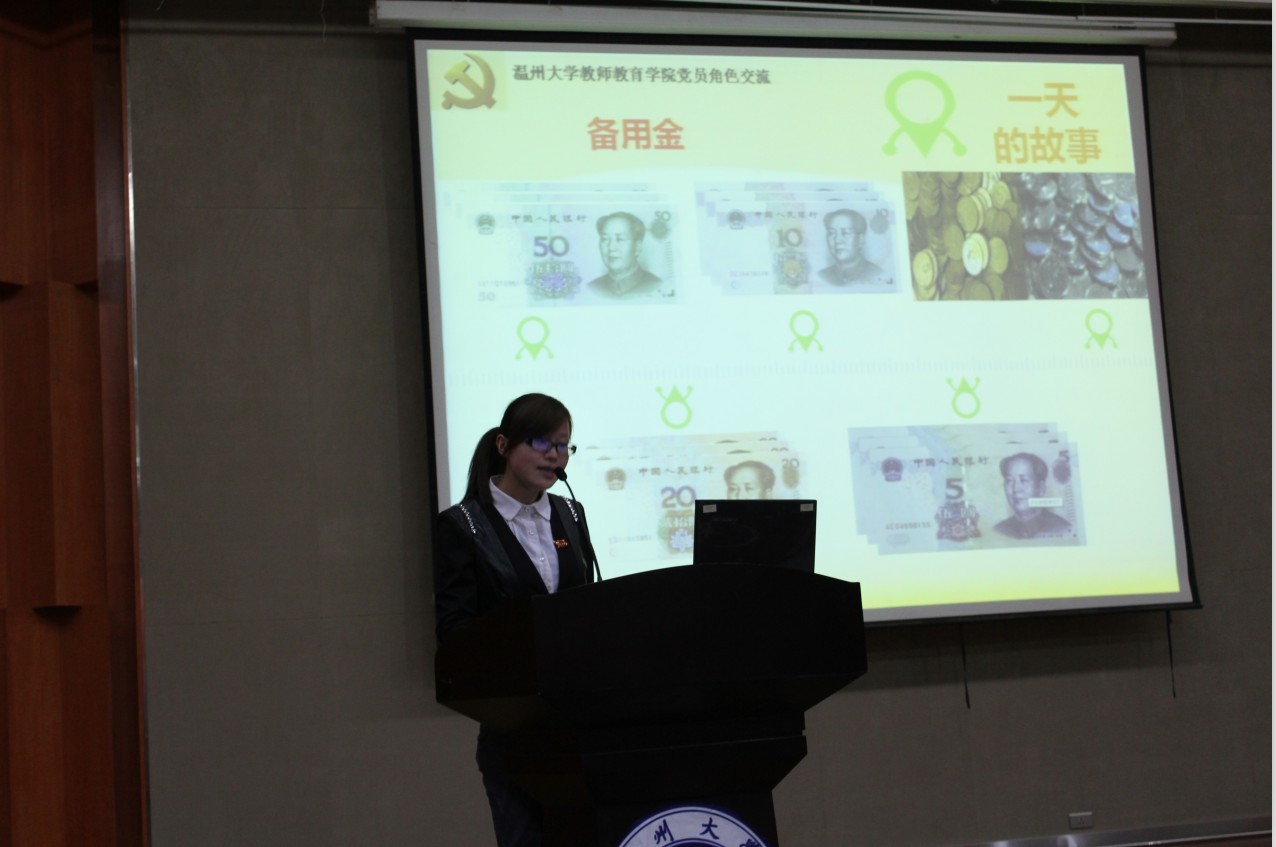 接着,我院6位学生党员与大家分享了他们在寒假期间的角色体验。陈京京同学体验的是支教教师这一角色,她联系自己寒假参与广西支教志愿服务的体验经历,呼吁广大同学们关爱、关注贫困山区留守儿童,为支持我国农村教育事业贡献出自己的力量,积极参与到“大学生志愿服务西部计划”中来。徐玉华同学体验的是超市收银员工作,收银员工作的严谨性、规范性,使得这份职业充满了挑战,而同事之间的相互关心,又使这份职业体验充满了温暖。朱文婷同学体验的是学校食堂工作人员这一角色,她回顾了这一周的艰辛与不易,她倡议同学们要珍惜人民群众的劳动成果,厉行节俭,拒绝浪费,参与到“光盘”行动中来。骆利锋同学体验了建筑工人的艰辛生活,建筑工人干着最累的活,拿着很少的工资,却用双手创造出了一幢又一幢雄伟的建筑。他们因为破旧的穿着、物质的贫乏,不被社会所重视。骆利锋同学以他的工友故事为例,号召大学生们尊重每一份职业。吴银选同学体验的是敬老院护工的角色,从她温柔细腻的声音当中,我们感受到了老年人的孤独与无奈,关爱父母、关爱老人就是关爱自己的未来。林敏敏同学体验的是家电售货员的工作,在她娓娓道来的讲述中,在场听众们了解了如何运用消费心理学做好推销,感受到只要你踏实、努力,三百六十行,行行能出状元。