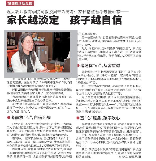 [第四期活动反馈] 温大williamhill官网副教授周奇为高考生家长指点备考最佳心态——家长越淡定 孩子越自信 2012-05-08