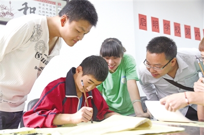 吃完饺子,志愿者们在黑板上写下“我爱你新疆”几个大字,然后和孩子们围坐在一张椭圆形的大桌子旁,并为聋哑孩子分发白纸、彩笔等绘画用具。志愿者们分工合作,有的教孩子们画画,有的教孩子们写毛笔字,有的和孩子们通过手势、纸笔交流,还有的与孩子们一起玩耍,并将带来的书籍、学习用品分发给他们。