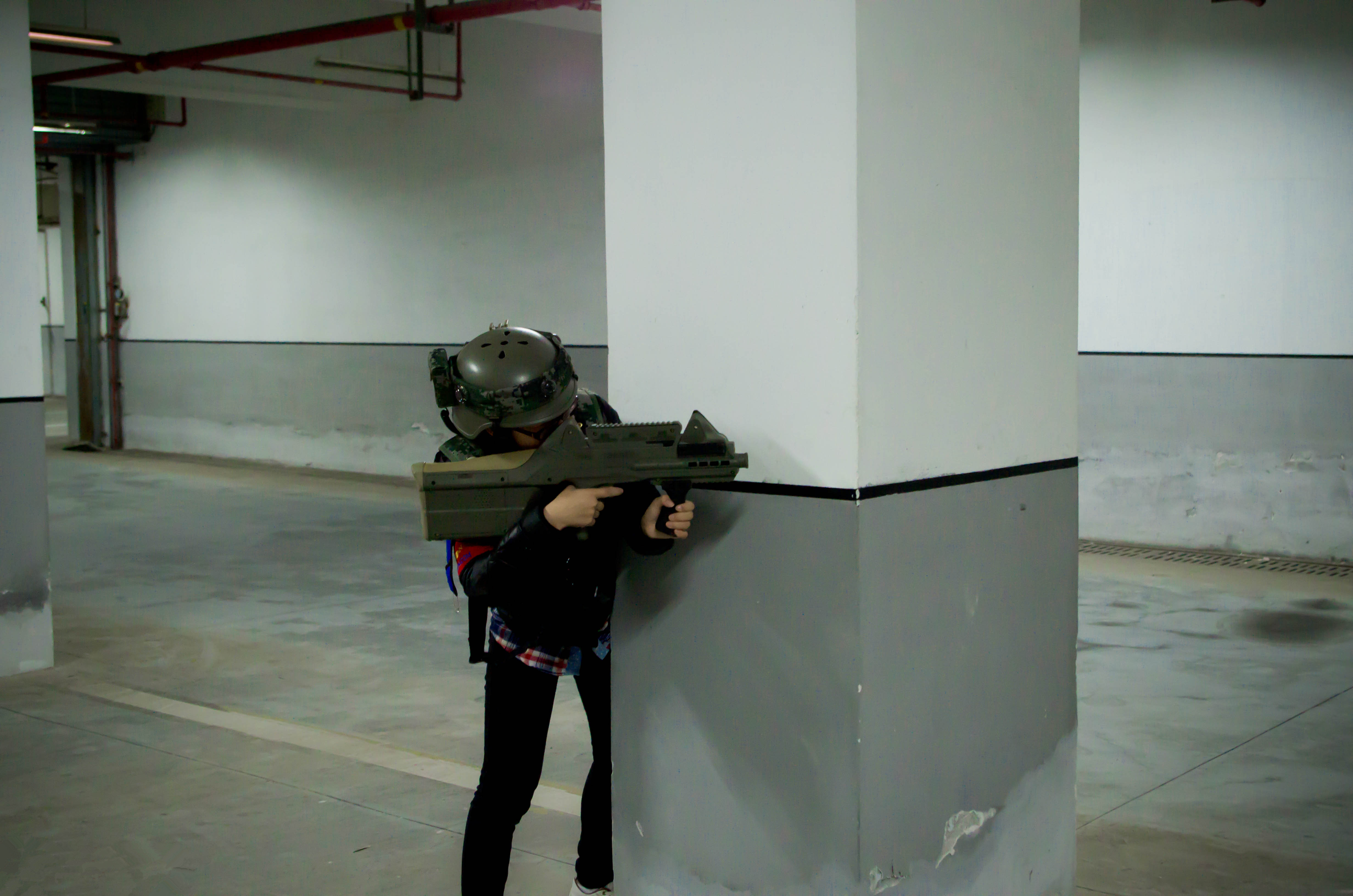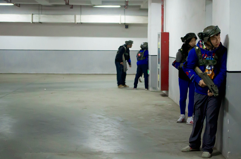 进行了短暂的试打后,紧张又刺激的对战终于吹响了号角。每个队都好像训练有素似的,谁攻谁守,谁打埋伏,谁做掩护,都安排得井井有条。霎时,偌大的场地里回响起了此起彼伏的“枪”声。每个人都必须全身心地投入战斗,因为冷不防在哪个角落就有一支“枪”正对着你呢。于是,团队之间的合作显得至关重要——每个人都不是独自的战斗者。历时两个小时的精彩大战很快就结束了,大家都有些意犹未尽。
