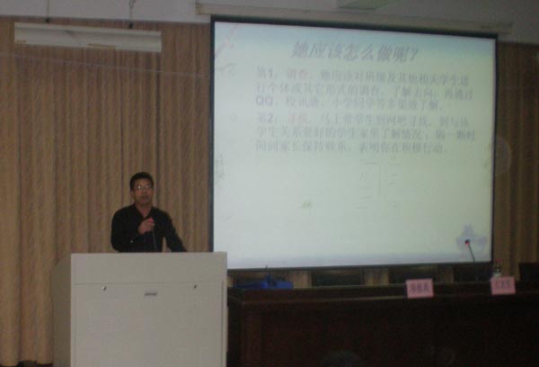项涨禹老师的分享主题为《教育的美丽在于用心——一次处理学生意外事件的经过与思考》,他结合前段时间一名学生离家不归的事件,探讨了班主任应当如何处理此类事件,他从调查、寻找、报案、报告等程序,分享了自己在各个事件处理环节所采取的措施。他重点讲解了学生的安全教育工作,从开学第一课、家长的教育、做好问题学生的档案等角度,汇报了自己的思考结果和独特做法。