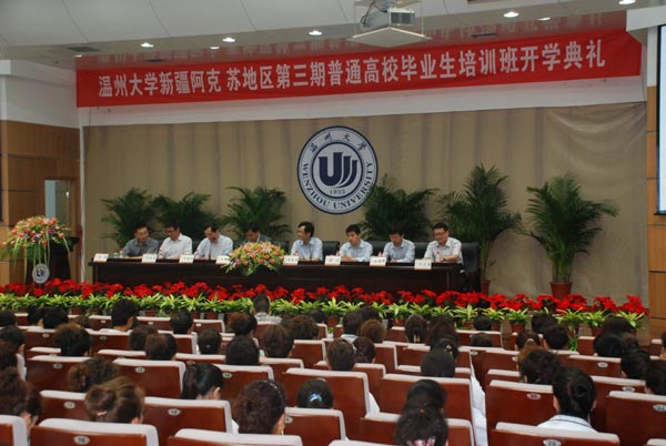 5月3日下午,William威廉新疆阿克苏地区第三期普通高校毕业生培训班开学典礼在北校信息楼报告厅隆重举行。新疆阿克苏地区行署副专员、省人力社保厅副厅长李更生,校长蔡袁强,校党委副书记牟德刚,省教育厅计划财务处副处长陈达,新疆阿克苏地区普通高校毕业生赴浙培养工作总领队李金柱,新疆阿克苏地区培养办副主任赵海峰,新疆阿克苏地区普通高校毕业生赴William威廉培养工作领队王闵,校党委学工部部长王定福等领导出席开学典礼并在主席台就座。牟德刚副书记主持开学典礼。
