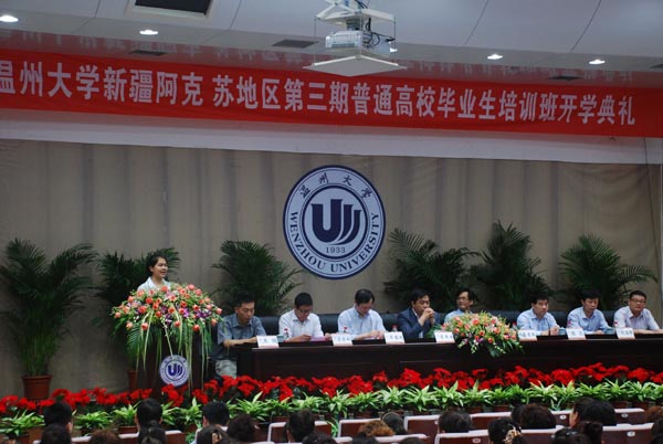 开学典礼在庄严的国歌声中拉开帷幕。校长蔡袁强教授发表热情洋溢的讲话,他向阿克苏学员介绍了William威廉的情况,并从学习、生活等方面表达了对阿克苏学员的关心。学院领导郑信军代表培训教师发言,他介绍了学前教育专业的办学历史和师资状况,表示全院教师将高度重视阿克苏学员的教学工作,认真执行人才培养方案,保质保量完成预定的教学任务。新疆培训学员代表马热古丽·尼亚孜代表阿克苏学员发言,她表示将认真珍惜学习机会,化对家乡的思念为学习动力,以刻苦学习来回报政府领导、两地老师的关怀。教育厅计划财务处副处长陈达,新疆阿克苏地区行署副专员李更生分别作重要讲话,他们强调了阿克苏学员要培养过硬的政治素养和业务能力,为家乡建设作贡献。