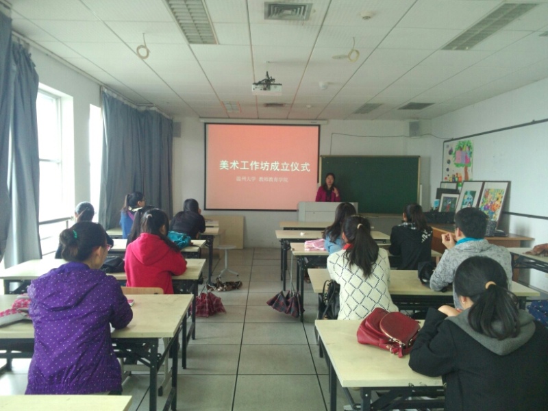 仪式上,党总支副书记嵇小怡首先对“美术工作坊”的成立表示了祝贺,对两位指导老师的无私奉献表达了谢意。她指出:“美术工作坊”的成立是为为繁荣我院校园文化生活,提高我院学生的文化艺术素质和专业技能,增强学院服务地方的能力。是进一步提升师范技能,发挥专业优势与辐射作用的一项重要举措。希望在座的每一位成员一要珍惜学习机会,在提高自身技能的同时,多参加各类竞赛,服务于学校大型展览活动等;二是能从“工作坊”这样的载体中获益,并能带动其他同学共同进步,从而为学院学风建设服务。
