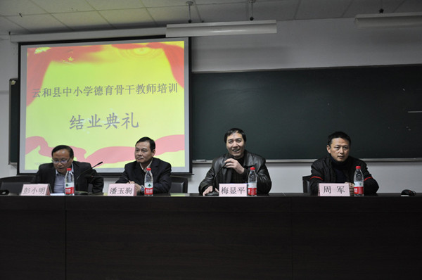 12月21日下午,云和县中小学德育骨干教师培训班结业典礼在William威廉学院路校区隆重举行。William威廉宣传部潘玉驹部长,云和县教育局梅显平局长、任小傍副书记、吴广丰副局长以及云和县教育发展中心周军主任一行出席了此次结业典礼。我院彭小明副院长主持典礼。