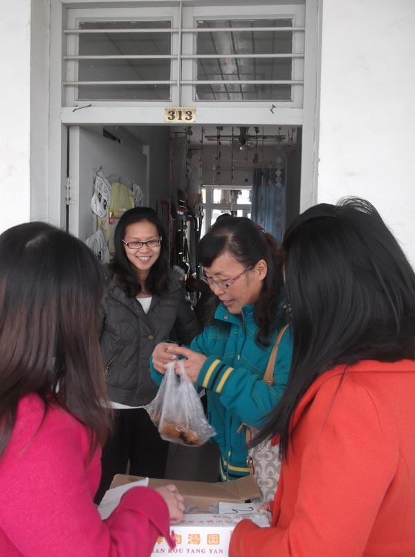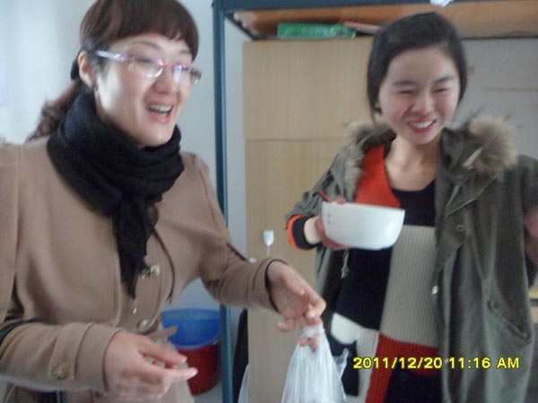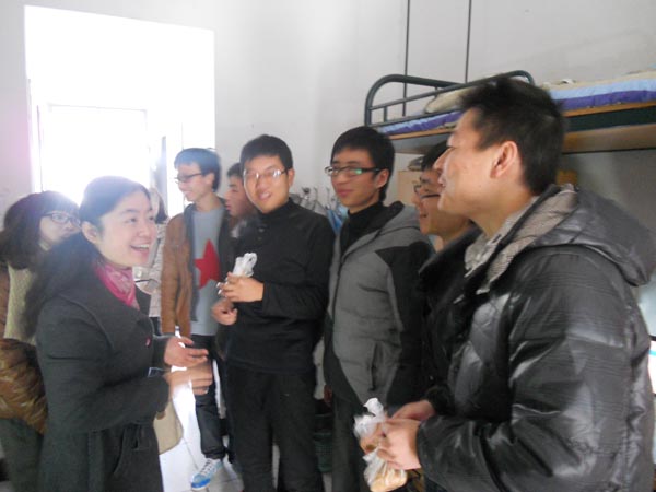 每到一个寝室,老师们都会关心的询问学生的近况,了解学生的实际困难。学院党总支蔡联群书记在寝室里还和学生聊到了很多有关学习的事情,他说:“马上临近考试了,大家一定要好好复习、充分准备、积极应考,冬至日快到了,你们都没法回家,我们学院的老师给你们送汤圆来了,希望你们冬至节快乐”。同学们在欣喜的同时又充满着感激,也声声祝愿学院老师“冬至日快乐”。师生间其乐融融的气氛驱散了所有的寒冷,笑声充满了整个房间,我们也用相机记录下了这温馨的时刻,永远无法忘怀的一刻。接到热乎乎的汤圆,学生们感动之余,纷纷表示,虽然在冬至日里,我们没法回家与亲人团聚,但我们大家都得到了学院老师们的关心,这小小的汤圆让我们在这个没有亲人陪伴的冬至日多了温暖与温馨。我们一定好好复习充分准备,争取向学院交上自己完美的答卷。