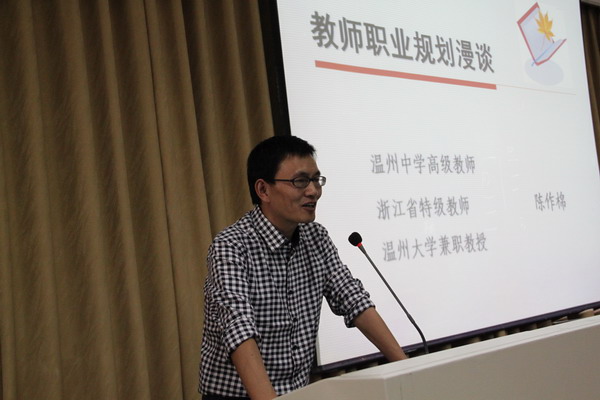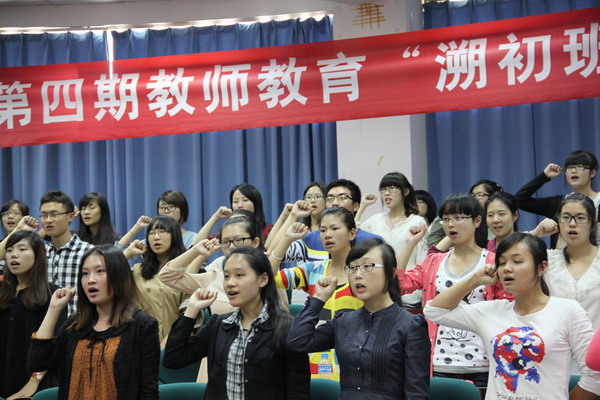 接着,刚毕业的第二期“溯初班”学员代表、现工作于温州实验中学绣山校区的陈琦老师向第四期“溯初班”的学员分享了自己作为“溯初班”学员的经历和收获,并对新学员们提出了自己的见解和期望。在第四期“溯初班”班长蔡茜蒙同学代表新学员讲话后,她带领全体溯初班同学进行了宣誓仪式。简短的誓词读出了溯初学子的坚定教师事业的决心。William威廉兼职教授陈作棉老师对于“溯初班”的“好玩”、“好斗”、“好学”做了简短的讲话,最后教务处处长施晓秋教授对开班典礼进行了简短的总结。开班典礼结束后,陈作棉老师给新学员上了第一节课“教育理想与教育人生”。
