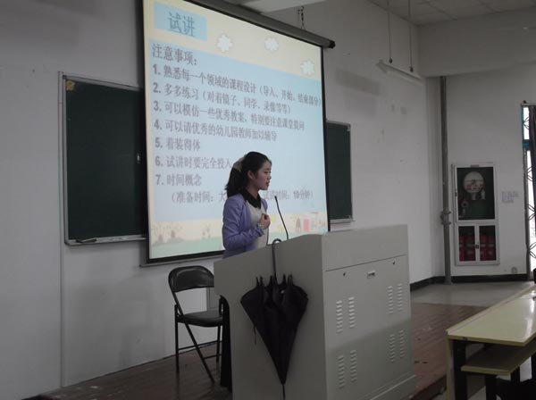林婷婷,毕业于我院09学前专三班,泰顺生源考上鹿城教师编制,现在温州市第三幼儿园工作。她就鹿城区幼儿教师招聘考试的程序和方法做了细致的介绍,并且向大家指导了在考试准备期间,如何合理安排时间同时准备笔试和面试的。她建议复习理论知识时,整理出大纲式的知识框架,借助知识框架回忆已经记忆的知识,还要通过做题来巩固理论知识。她结合部分考题向毕业生阐述了答题要领;结合面试的基本形式,指导毕业生要结合自身实际选择才艺展示项目。