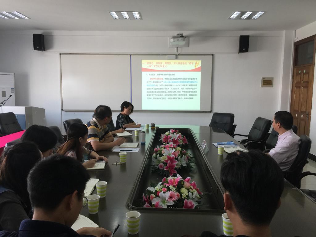 郑信军部长听取汇报后充分肯定了学院党总支在工作中的实践创新。他指出,要认真学习领会习近平总书记系列重要讲话精神,进一步贯彻落实好高校思想工作会议精神,按照两学一做学习教育常态化制度化要求,全面落实基层党建全面落实年的各项工作部署与要求,要进一步创新党建工作品牌,切实履行好主体责任,做好党建、意识形态工作和党风廉政建设等方面工作,要重视解决薄弱问题,在关键问题上不能放松,继续保持和发挥学院党建的先锋示范作用,以党建引领事业发展。