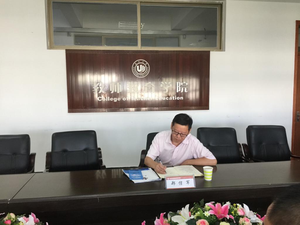 杨立淮书记代表学院向郑部长做工作汇报。他提到,学院党总支深入推进学院“两学一做”常态化制度化,抓常态、抓制度、抓落实,把思想政治教育摆在首位,理论学习分层分类,树立党的一切工作到支部的鲜明导向,“三会一课”规范化,党日活动和党员实践教育主题化。今年五月份学院党总支面向全体支部、党员和广大师生提出,在党员党性修养和支部建设中要自觉开展“三问三做”:要经常问问自己贯彻落实文件精神和理论学习是否到位,党员先锋模范作用发挥是否到位,履行工作职责是否到位,要做学习典范,做合格党员,做基层堡垒。以“三问”促“三做”,自觉将“''在日常,''在经常”落到对自身学习成果与作用发挥程度的日常检验中去。他还对目前存在的问题和下一步的工作打算做了阐述。杨丽君副书记就学生党建工作及存在的难点做了补充。