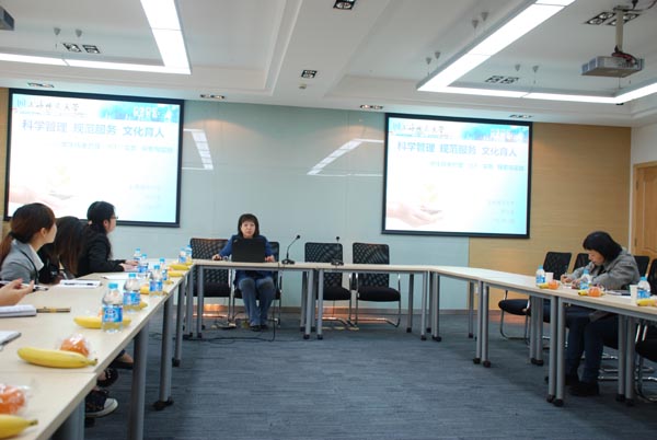 4月13日上午,考察学习团到达上海师范大学。上师大学工部副部长张益、williamhill副书记谢青、后勤集团副总经理张红英、学工部思想政治教育办公室主任张兰及团委书记黄琼翠对我院师生一行表示了热烈的欢迎。随后,我院嵇小怡副书记将学校、威廉概况向上师大的领导和老师们作了简单介绍,并表示要向上师大好好“取经”。张兰主任首先介绍了本校学生管理及学生公寓工作的情况,并向我们着重讲述了“五进”学生宿舍的工作思路,即思想教育进园区、党团教育进园区、文化和学术活动进园区、就业指导进园区、心理健康教育进园区。希望通过“五进”宿舍活动,可以达成学生党员受教育,全体学生得启迪,综合素质上水平,全面发展见成效的局面。在后勤管理方面,张红英副总从“六T”简介、“六T”历程、“六T”建设、“六T”成效四个方面对“六T”实务工作作了详尽的介绍。秉着“设身处地为学生着想,真心实意为学生服务”的工作理念,后勤集团通过“六T”工作的开展,真正做到了“常规工作抓落实,重点工作抓推进,特色工作抓拓展”。最后,谢青书记从“大学工”工作理念、辅导员队伍建设及师范生专业培养三方面介绍了上海师范大学williamhill的学生工作。