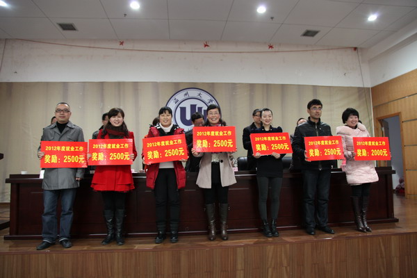 大会还表彰了在2012年学院就业工作中取得优异成绩的老师。2012年,在大学生就业形势不乐观的情况下,我院取得了本专科学生就业率94.82%、研究生就业率100%的喜人成绩,两者均大于校平均值。为此,学院决定对折延东、赵颖、陈秋珠、谢子静、陈飚、陶陶、杨婧等七位老师及就业专职人员进行奖励。