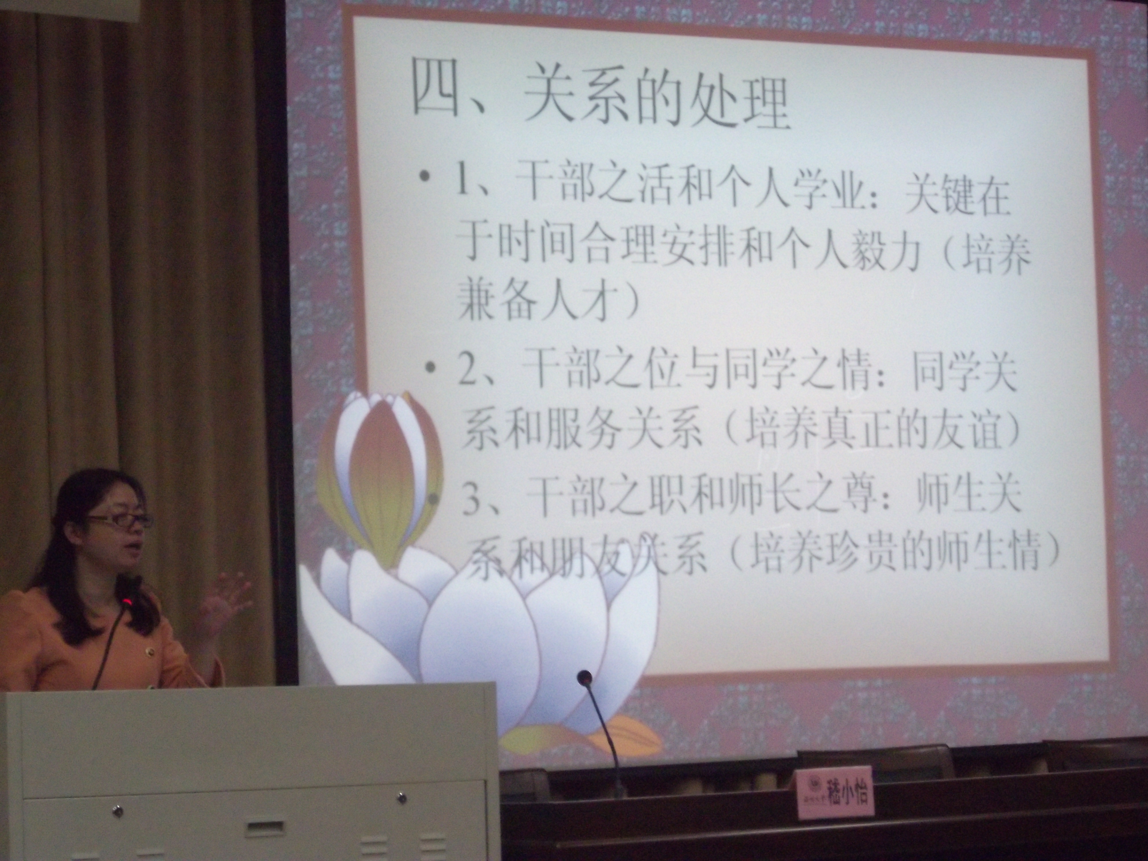 嵇书记从三个方面引导团学干部去思考怎样收获幸福。第一:读大学,究竟读什么?第二:读大学,究竟为什么?第三:读大学,究竟怎样读?嵇书记认为“幸福”可以用“读万卷书,行万里路”这句话来概括,即知识技能和能力实践缺一不可。接着,嵇小怡书记又从团学干部角色的认知、团学干部能力的获得以及团学干部关系的处理等方面详细的阐述了工作与学习,收获与能力的联系。嵇书记还针对团学干部面临的困难提出了自己的意见。嵇书记的真知灼见赢得了团学干部们的阵阵掌声。