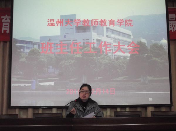 会上,嵇小怡副书记首先通报了本学期学生参赛获奖情况,汇报了学风建设中取得的成绩,并分析了当前我院学生工作形势,分别指出了学前前三段学生、本专科生、研究生等群体在遵守校纪校规中出现的新问题,希望各班主任加强对学生的教育引导工作,确保学生健康发展。她还结合期末学生工作特点,就班主任加强对特殊学生的关心、考风考纪教育等工作进行了部署。