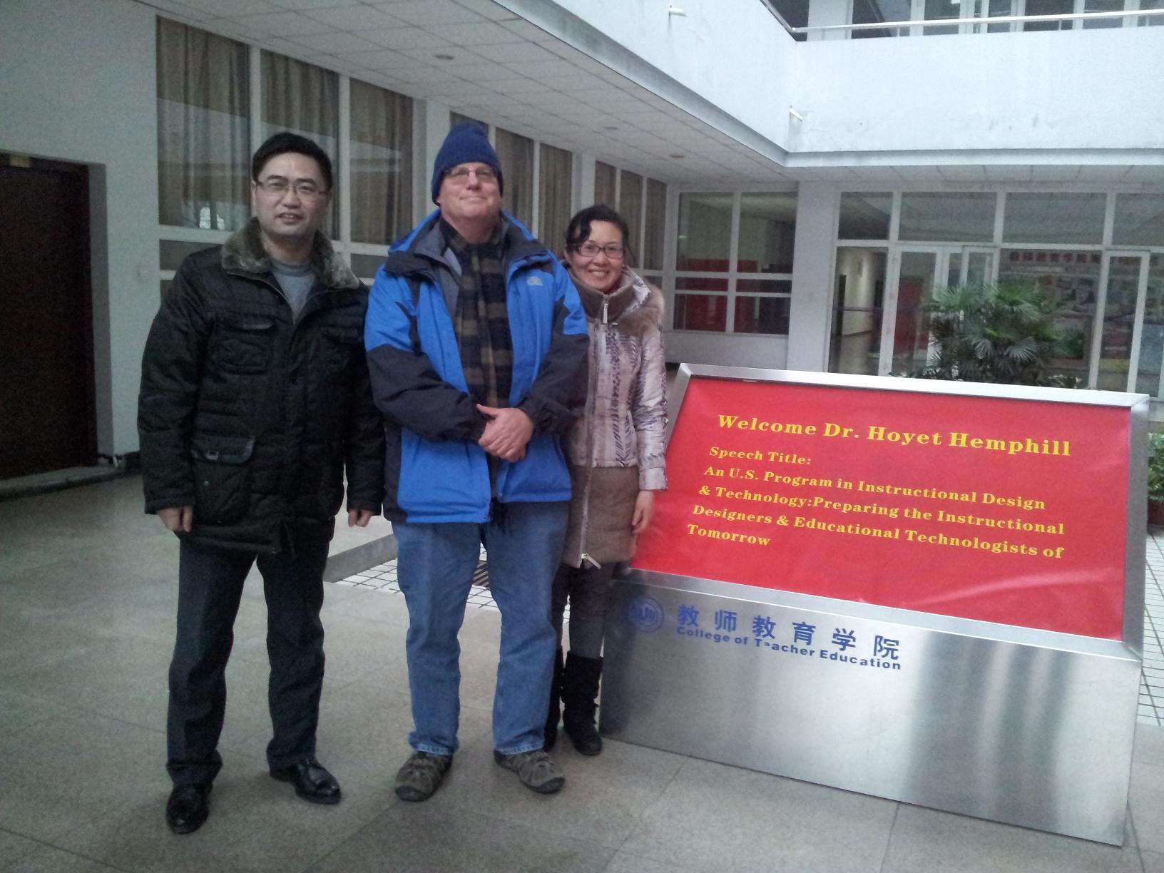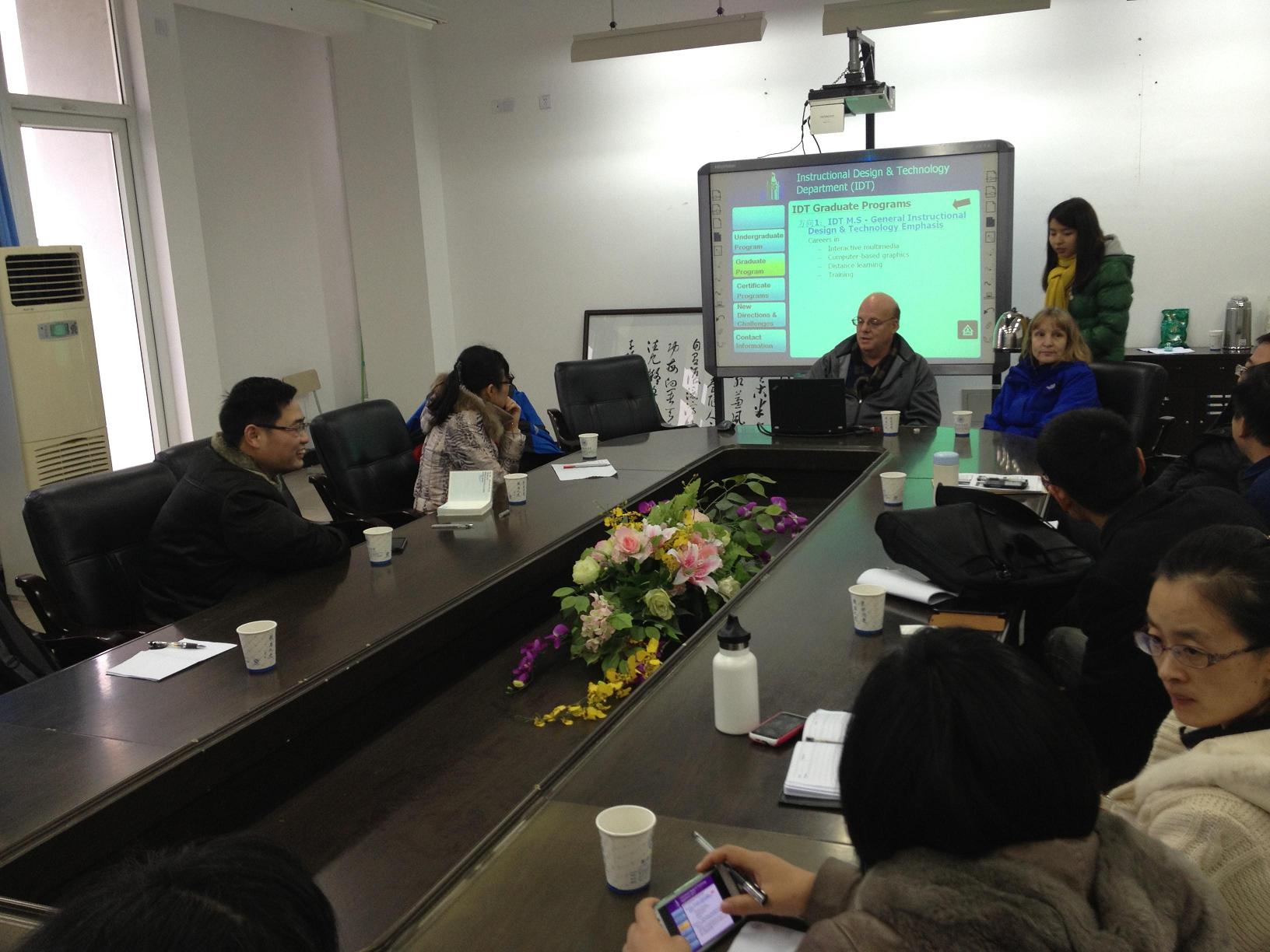 为了促进教育信息化研究所教师的科研能力,2013年1月4日下午15:00,教育信息化研究所在北3-311举办了“如何提高教师科研能力”为主题的学术沙龙活动。本次学术沙龙由教育信息化研究所所长胡来林教授主持,学院领导彭小明副院长与研究所的全体教师、部分研究生和本科生参与了本次交流活动。在这次活动中邀请了美国西伊利诺斯大学(Western Illinios University )教育技术系主任怀特( Hoyet Hemphill )博士和琳安达( Leaunda Hemphill )博士。在活动中,Hoyet H. Hemphill博士做了题为“An U.S. Program in Instructional Design & Technology: Preparing the Instructional Designers & Educational Technologists of Tomorrow”(《美国教学设计与技术专业:教学设计师培养的现状及展望》),并与本研究所教师就“研究生与本科生的培养机制、技术如何提高学生的学习能力、学生实践工作”等内容进行了深入的学术对话与交流。