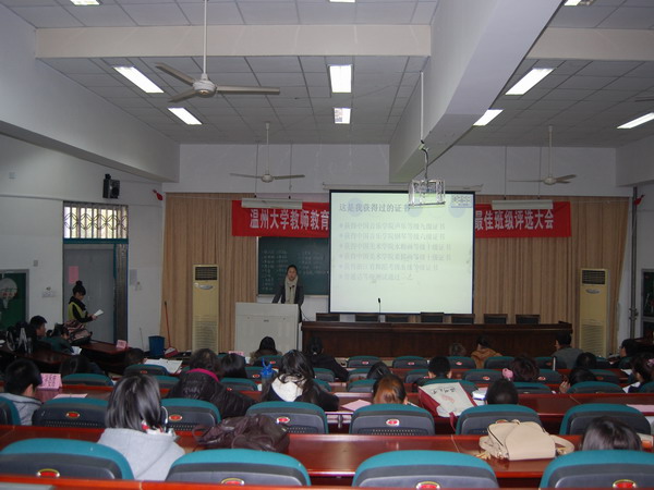 优秀学生评选结束后,紧接着是最佳班级的评选活动,同样分班级展示、答辩、投票三个环节。08小教本一、09小教中文、09小教数学、09学前本、11学前大专二班及09学前中专一班共6个班级入围了此次评选活动。在班级展示环节,11学前大专二班带来了别开生面的表演,向大家展示了本班的风采;来自09小教中文班的同学们也个个有备而来,通过书法、美术作品等展现了本班同学多才多艺的一面;提到“向幼转”,自然而然地想到了09学前本的一群可爱的同学们,她们高涨的热情就足以体现她们班级强大的凝聚力。开头的那一幕便是09学前本在班级展示前喊出的口号。