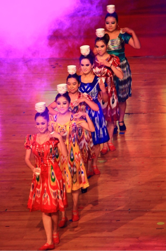 开场舞《喜鹊喳喳叫》,美丽的姑娘们着一袭蓝衣,造就了一场曼妙灵动的舞蹈,也掀开了第一篇章《盛世华章》的序幕。由应伊卡等同学带来的表演唱《大地飞歌》,又再一次震撼了全场,亮闪闪的苗族饰物相互碰撞的清脆与同学们完美的歌喉相和,伴着美妙的舞姿,极完美地诠释了她们心中的大地飞歌。语言艺术工作坊的学生们,也带来了他们所理解的不同于戴望舒的《我的雨巷》,款款深情,带着丝丝忧愁,在他们时而低沉,时而昂扬,时而悲伤,时而欣喜的吟诵中娓娓道来。在同学们的精彩表演后,各位老师们也按耐不住了,给我们带来了《主任好声音》节目,各系主任共唱《相亲相爱一家人》,温馨的歌词,甜美的歌声,完美诠释了我院“师生一家人”的和谐氛围。嵇小怡副书记和三位同学的古筝合奏,再次点燃了晚会的高潮,师生各怀绝技,同台献艺,其乐融融。我院乐清教学点的同学们带来了群舞《万泉河水》,他们的舞艺让现场观众为之倾倒,虽然她们是我院年纪最小的学生,但是她们的基本功和舞台表现力不可小觑。我院新疆班同学带来的顶碗舞,让观众们领略到了少数民族的热情。师生载歌载舞,学院欣欣向荣。