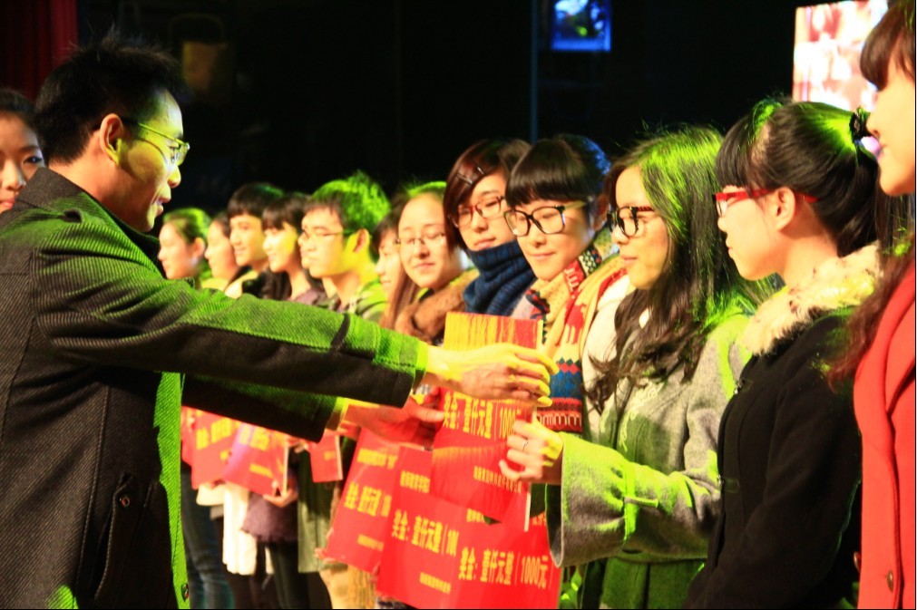 本次晚会还为现场观众准备了丰厚的礼品,学院在寒冷的冬天里,为同学们准备了温暖的手套、围巾,特邦公司还赞助了特等奖“罗菲妮”皮包,引发了粉丝的争相追捧。从下午布置场地开始就有同学们不断在我院元旦微博墙不断留言、刷屏,期望高频率的留言可以增加获奖的几率。另外,同学们的新年祝愿卡片也充满了抽奖箱。晚会现场通过抽取新年祝愿卡,抽取了五十位观众荣获三等奖,三十位观众荣获二等奖,五位观众荣获一等奖。礼品虽小,但是代表了学院对于同学们浓浓的关爱,也是我院惠生工程的具体体现。