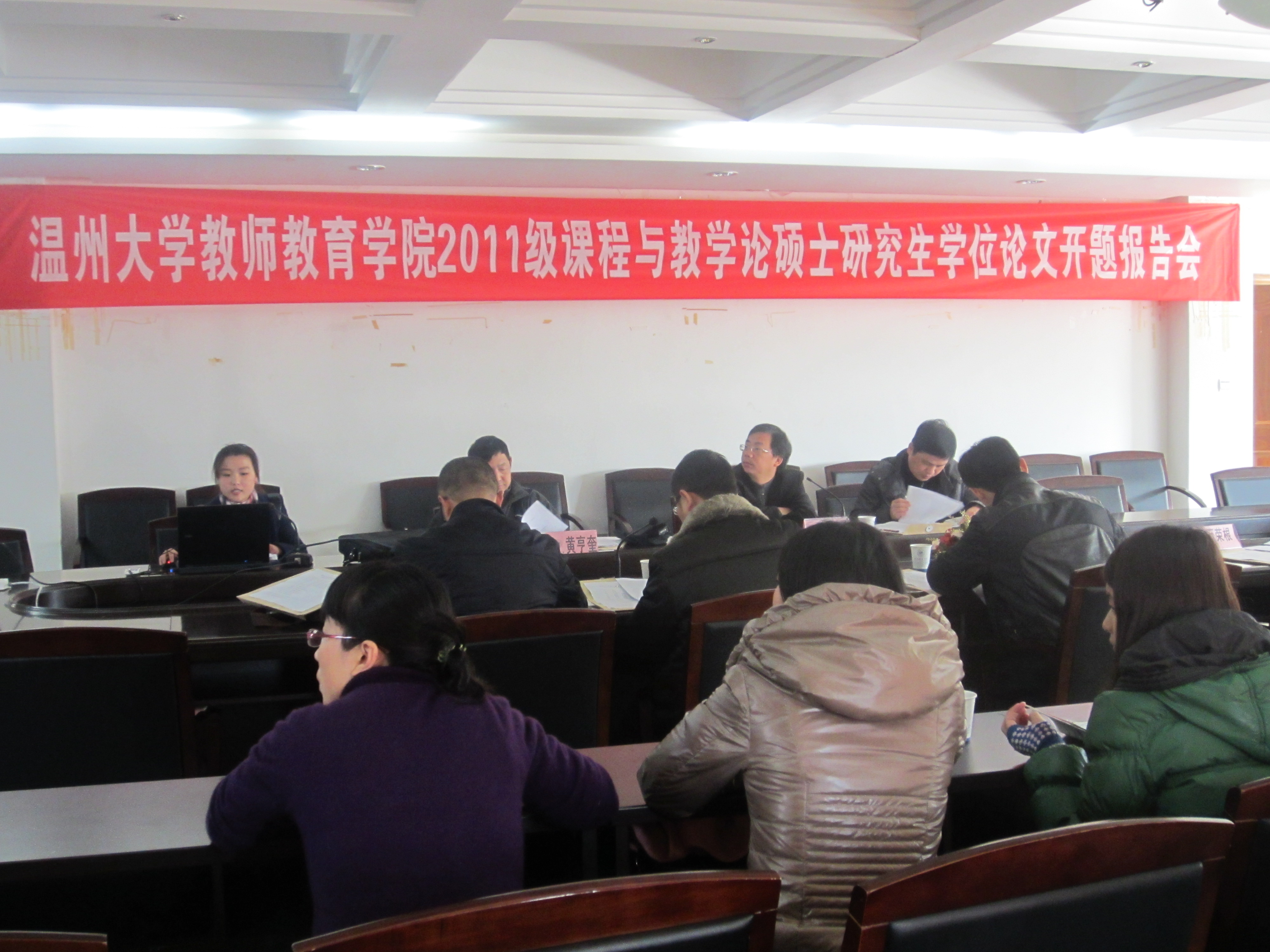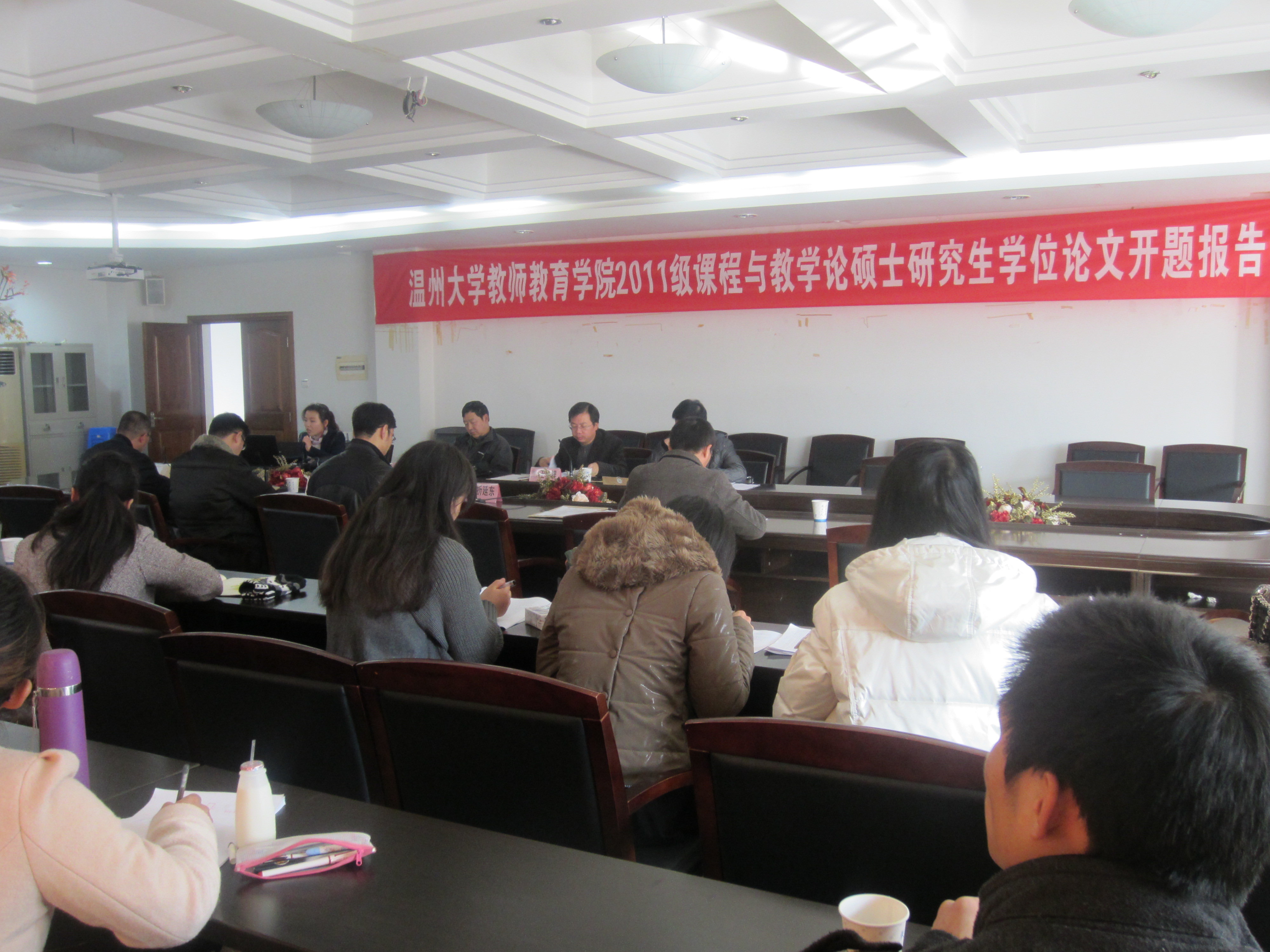 2012年12月28日上午,我院2011级研究生毕业论文开题报告会在北校区行政楼125会议室和418会议室召开。开题报告会分教育综合和信息技术组、教育心理学组两组同时进行,分别由胡来林教授和徐速教授主持,郑信军、胡瑜、王佑镁等12位评议组成员以及11级、12级全体研究生参加此次开题报告会。