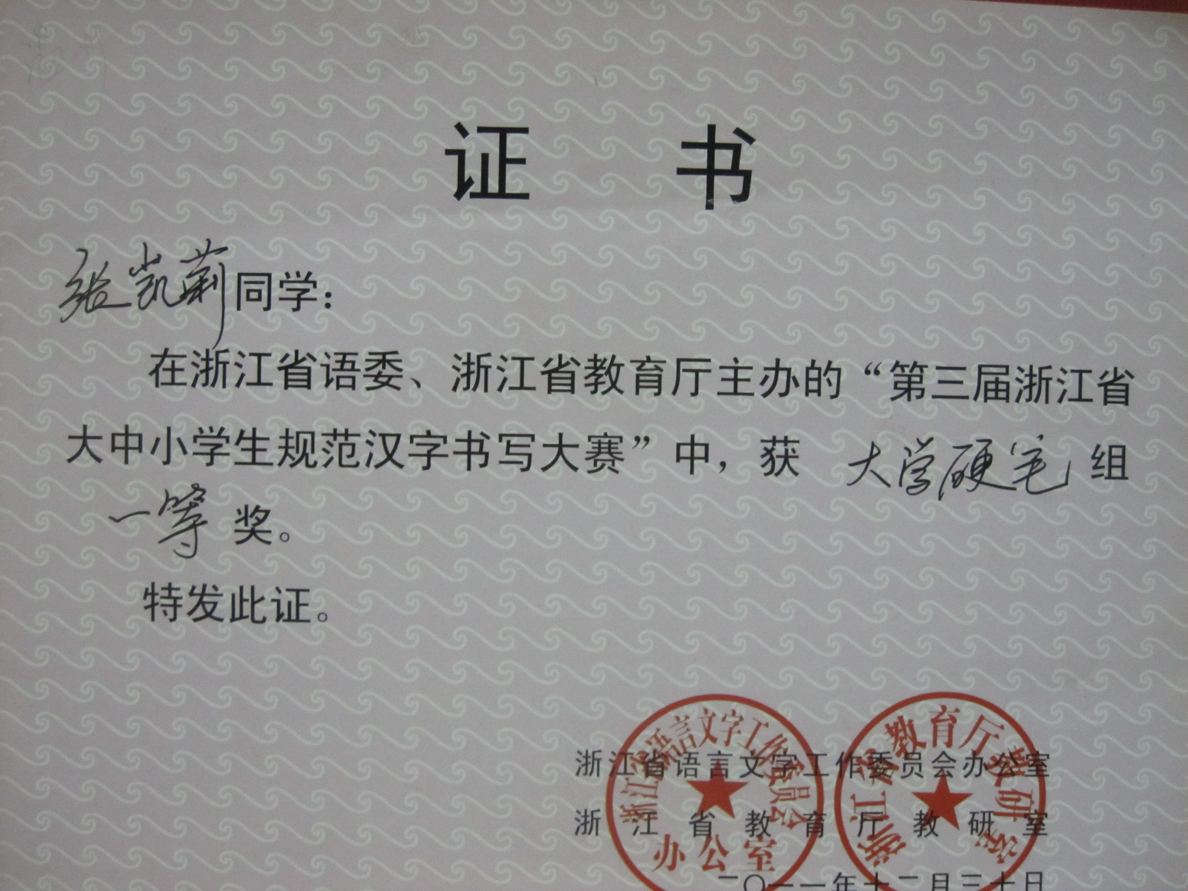 4、 2011.10浙江省大学生艺术展演比赛一等奖。