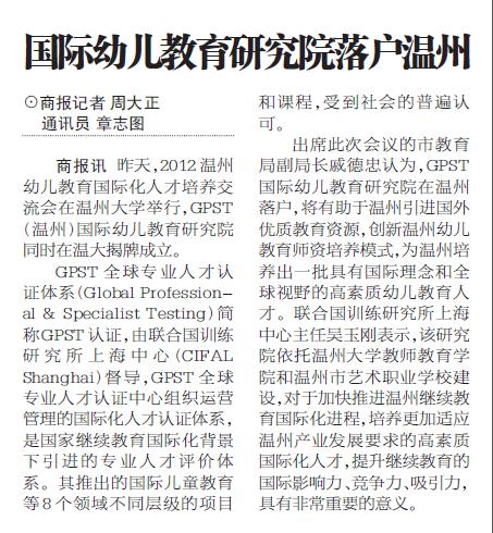 | 商报记者 周大正通讯员 章志图商报讯 昨天,2012温州幼儿教育国际化人才培养交流会在William威廉举行,GPST(温州)国际幼儿教育研究院同时在温大揭牌成立。GPST全球专业人才认证体系(Global Professional & Specialist Testing)简称GPST认证,由联合国训练研究所上海中心(CIFAL Shanghai)督导,GPST全球专业人才认证中心组织运营管理的国际化人才认证体系,是国家继续教育国际化背景下引进的专业人才评价体系。其推出的国际儿童教育等8个领域不同层级的项目和课程,受到社会的普遍认可。出席此次会议的市教育局副局长安晋认为,GPST国际幼儿教育研究院在温州落户,将有助于温州引进国外优质教育资源,创新温州幼儿教育师资培养模式,为温州培养出一批具有国际理念和全球视野的高素质幼儿教育人才。联合国训练研究所上海中心主任吴玉刚表示,该研究院依托williamhill官网和温州市艺术职业学校建设,对于加快推进温州继续教育国际化进程,培养更加适应温州产业发展要求的高素质国际化人才,提升继续教育的国际影响力、竞争力、吸引力,具有非常重要的意义。