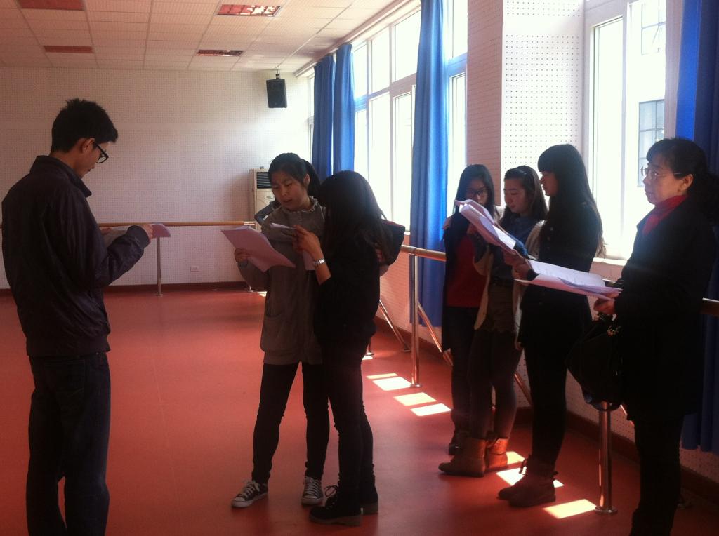 在前期准备上,我们班级分为四个剧组,每个剧组在一周内各自写出一个剧本,在郑老师的全面的点评、指导后,同学们认真完成了剧本的修改工作。同时,每个剧组的导演、演员、服装、道具、音乐和舞美等人员也依次确定。