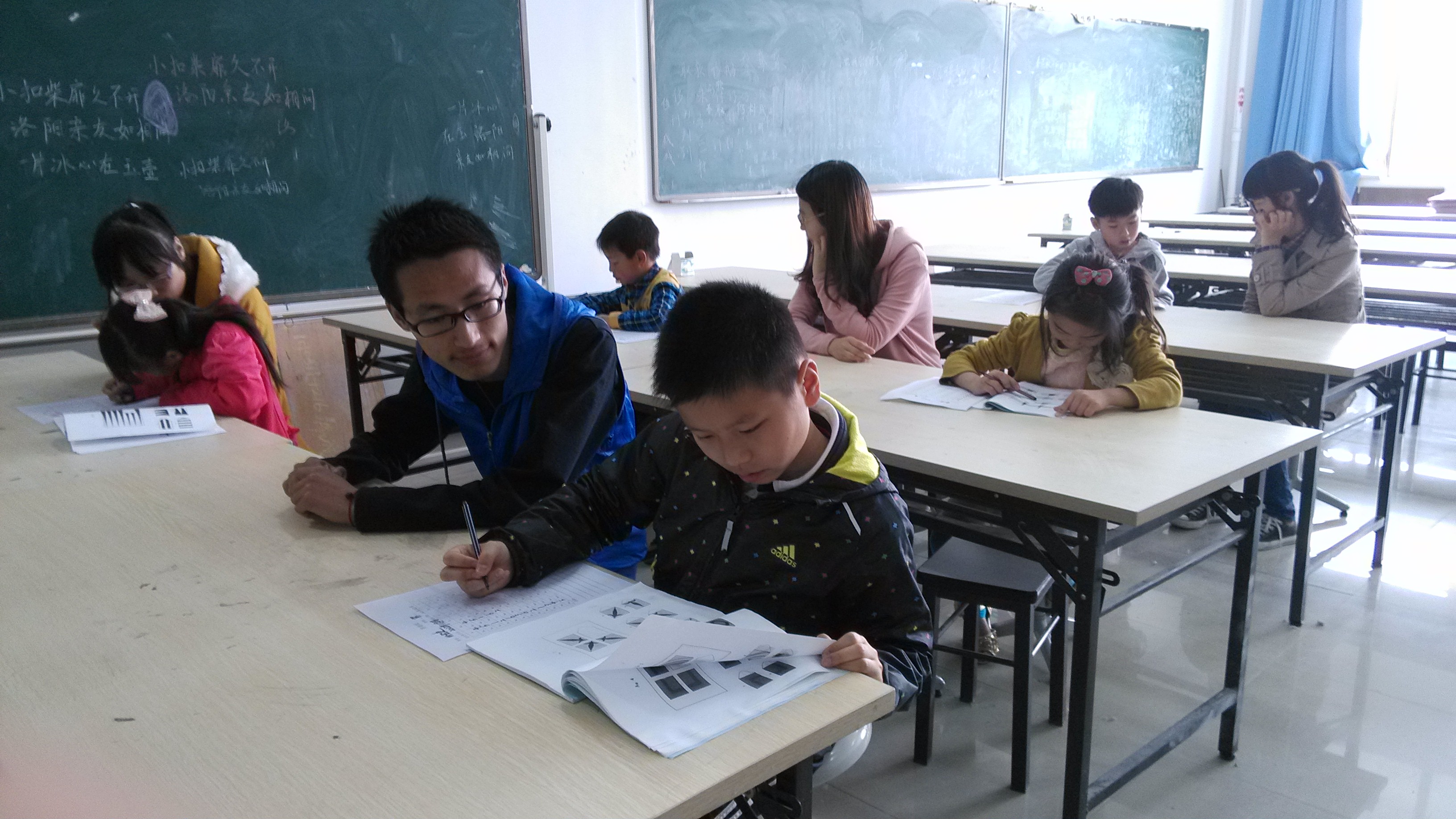 本次心理测验活动仍运用瑞文测验联合型(CRT),对年满5周岁以上的孩子进行逻辑推理能力的测评,由于参与人员较多,活动分上、下午两场。上午的活动对象为温州市实验小学一年级的27位学生,通过一对一的施测方式,心理健康测量工作坊的学生以生动清晰的指导语向小朋友们解释了瑞文测验的施测过程,小朋友们也认真地完成了整个测验。在施测过程中,家长们也积极与陈老师交流沟通,了解此次测验的目的,陈老师也根据小朋友的测验结果给予了的相应的建议。下午的活动对象主要是26位环卫工子女,采用团体施测方式,在给小朋友讲解了测验指导语之后,由小朋友自己填写答案,心理健康测量工作坊的学生在一旁观察记录每一位学生做题状态,以便测验结束后作综合评估建议。