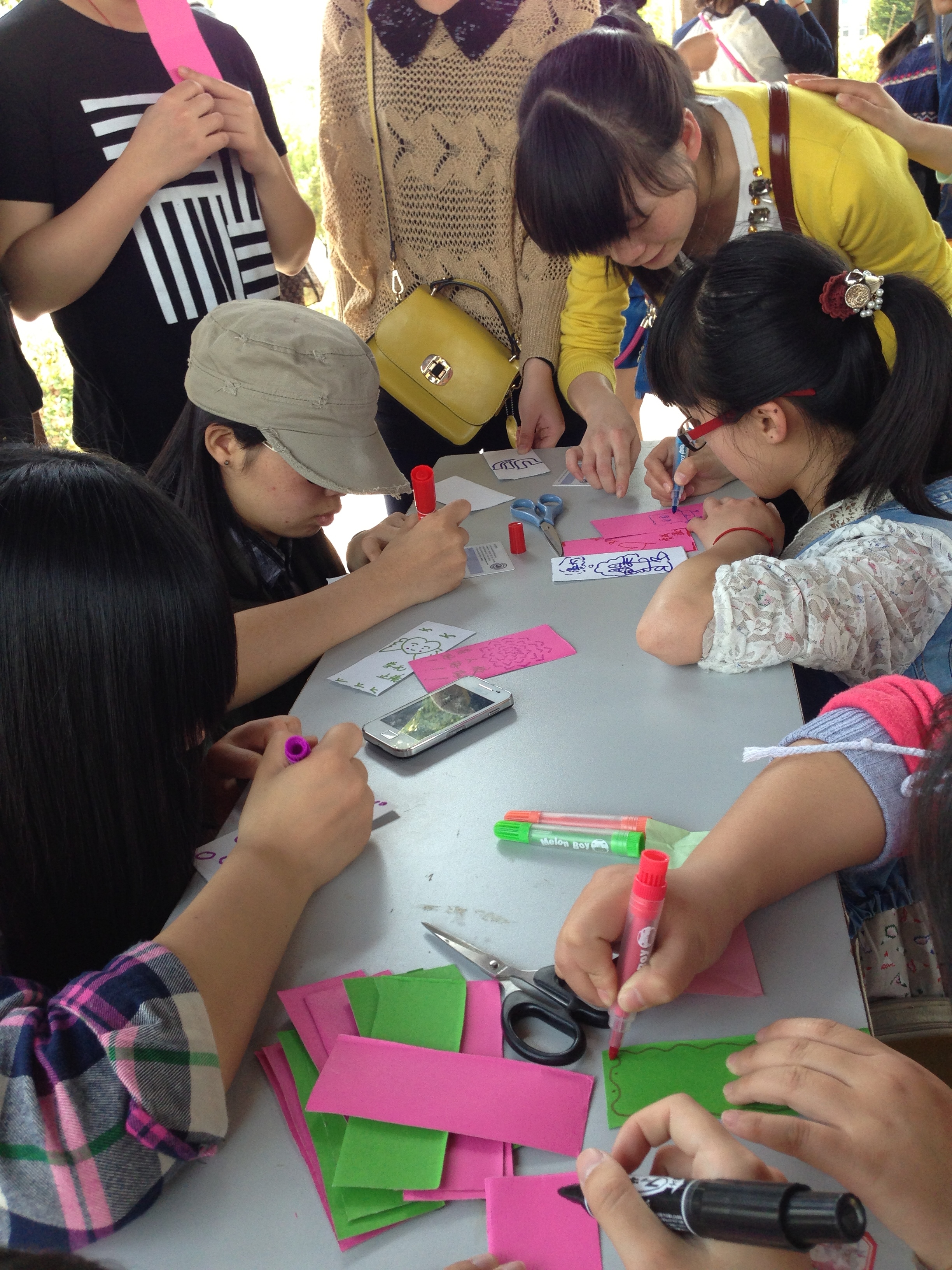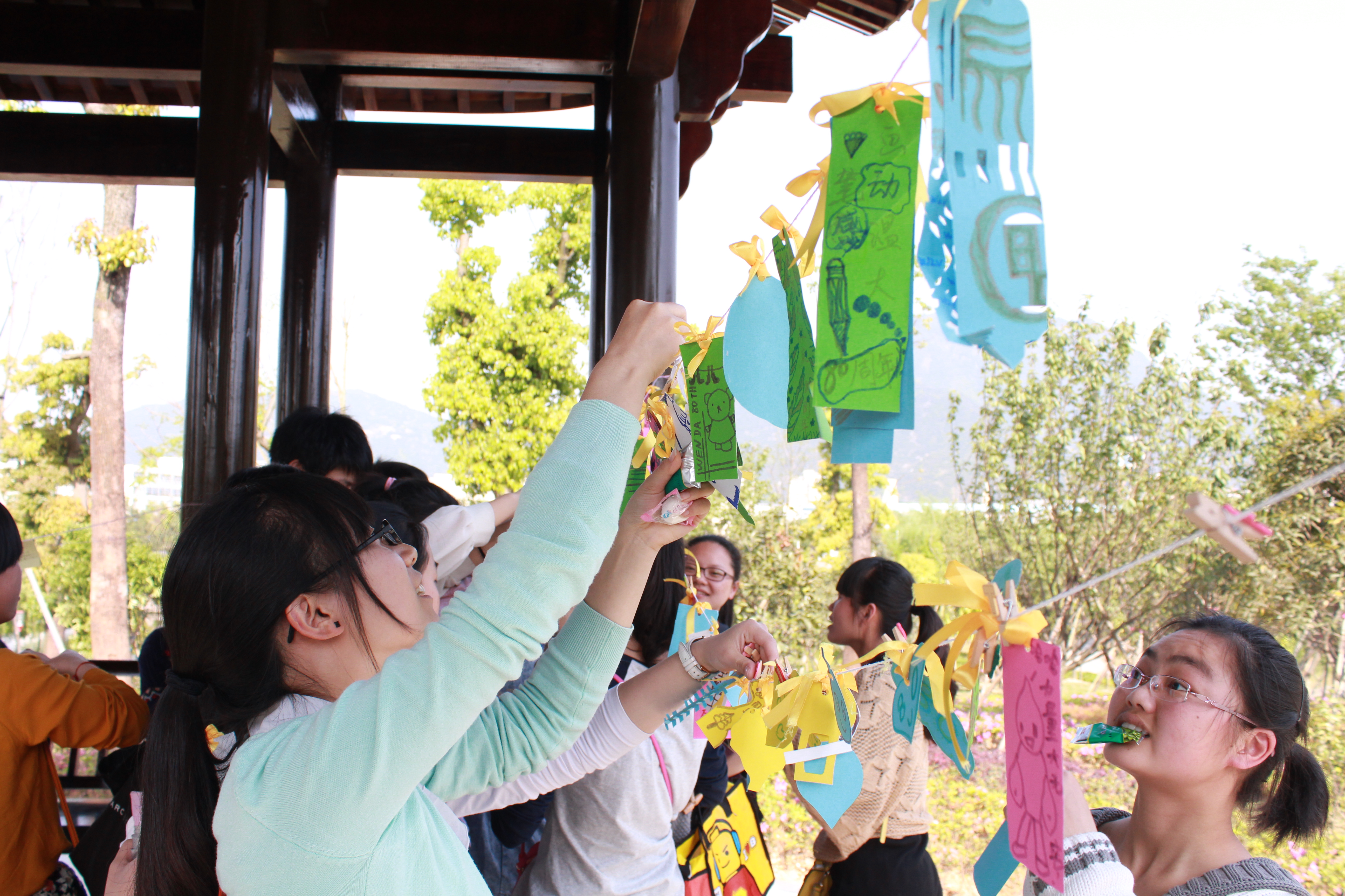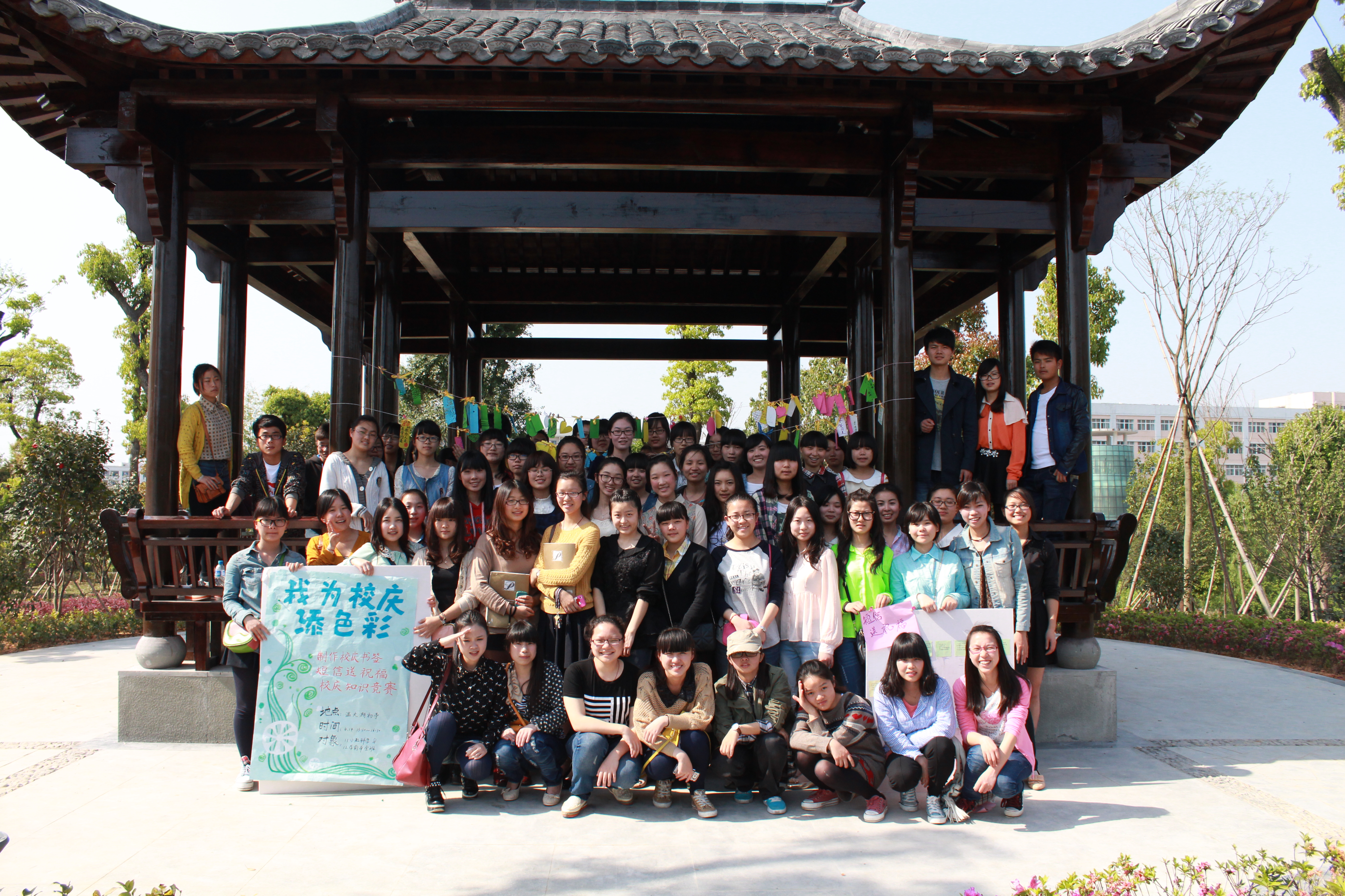 本次活动共分三块内容:制作校庆书签、短信送祝福评选、校庆知识竞赛。当天,溯初亭的柱子上,被一根根彩带串联,同学们把融入自己祝福的书签挂在彩带上,随风飘扬。期间,同学们还对征集的祝福短信进行评选,并开展校庆知识竞赛,在认识、了解学校历史、概况等基础上更好地迎接校庆,为校庆出一份力。
