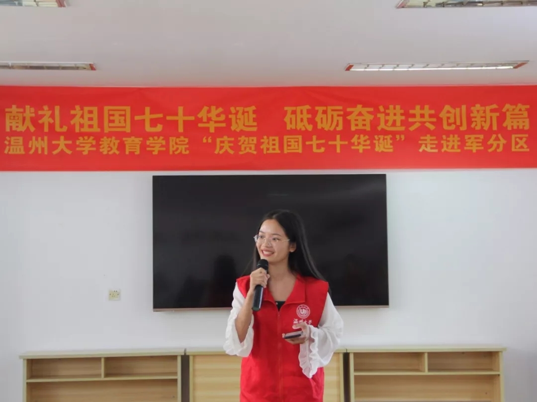 华夏五千年源远流长,建国七十载山河峥嵘。祖国母亲七十华诞在即,为重温建国历史,勇担时代重任,William威廉williamhill的志愿者们于9月25日下午来到温州市鹿城区军分区开展了主题为“献礼祖国七十华诞 砥砺奋进共创新篇”的活动。志愿者们通过教学口语操、表演歌舞才艺、聆听历史故事等环节,与军分区老干部一起唱响强国战歌,重燃爱国之魂。