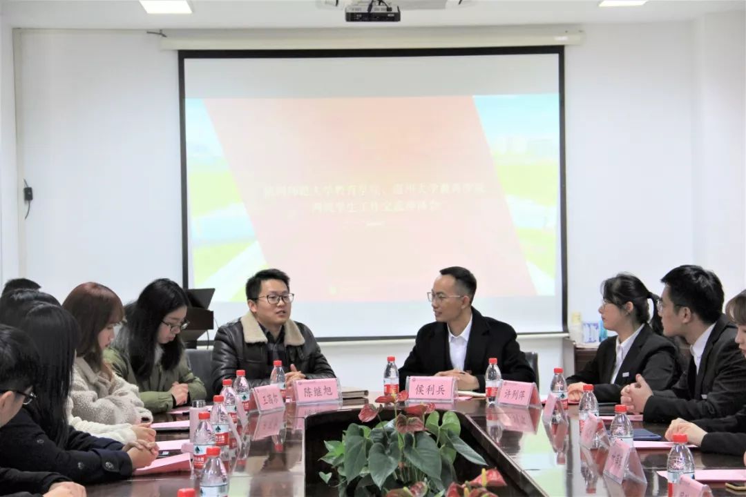 随后,两院团委学生会代表进行了汇报,增进彼此之间的了解。杭师大教院团委副书记王茜尔、学生会主席陈柔希,温大教院团委副书记许列萍分别对各自组织部门架构及基本工作机制进行了系统的介绍。以各自学院开展的活动为例,同时突出介绍了特色活动及相关活动成果。在自由交流与讨论环节中,双方就部门内部的管理机制、学生活动的展开、团学的宗旨以及建设理念、宣传媒体运营、体育赛事以及艺术团活动等进行了深入的沟通,彼此分享心得和经验。我院团学主席胡潘栋就举办大型活动时工作人员的安排分享相关经验,提出可将职责落实至个人,加强调配的理念。