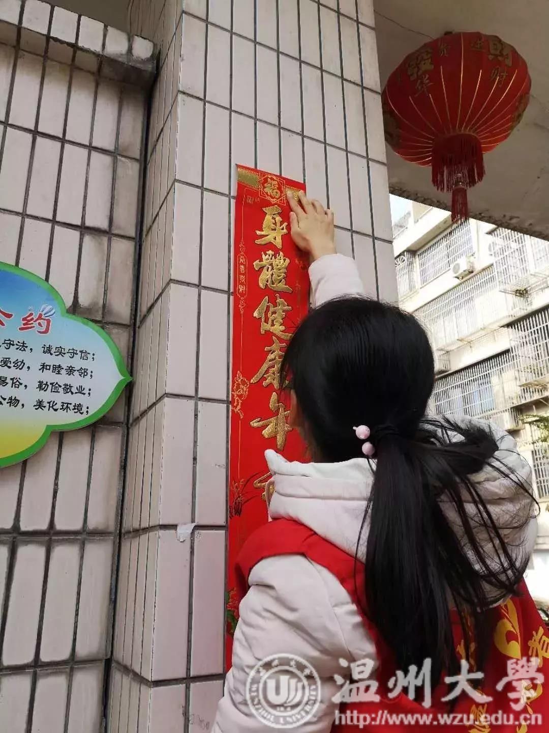 新春将近,志愿者们将新春的红带入生活,带入家庭。他们为社区的老人们贴上福字和春联,喜庆的红色为棕色的门楣增添了无数新年的气息。志愿者们将新春关怀传播到每一户家中,传递到每一位老人心间,为寒冷的冬日注入温暖与活力。冬日的暖阳映着志愿者们的笑脸,他们将手中的福字交给老人们。福字,传递的不仅仅是温大学子对老人的祝福,更是对中国文化的一种传承。当一幅幅红色的福字,从他们的手中交由老人们手中时,属于中华的传统文化在传递,属于温大教院的社会关怀在传递。