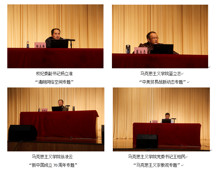 在学院领导老师的悉心组织和主讲老师们的精心授课下,19级945新生认真参与了本次讲座。校纪委副书记杨立淮老师就“清朗网络空间”的知识展开专题讲座,他提出用哲学和现代化的思维看待网络,正确应对网络风险,并要求学生提升自身媒介素养,谨防上当受骗。马克思主义学院蓝立志老师以“中美贸易战新动态”为专题,围绕中美贸易战的前世今生、坚决反对美国贸易霸凌,从多个方面分析中美贸易战新动态,为同学们展开了一场精彩绝伦的贸易战分析。马克思主义学院徐凌云老师从中国共产党在苦难中诞生、中国共产党在苦难中成长这两方面向我们展示了以毛泽东主席为代表的新一代中国共产党人谱写的壮丽史诗。学好党章党史,了解过去才能把握今天,把握今天才能创造美好的明天。马克思主义学院党委书记王柏民老师以“马克思主义宗教观”为题,从马克思主义宗教观的哲学基础、马克思主义宗教观的主要内容、马克思主义宗教观的中国化等三个方面向我们阐述如何运用马克思主义树立正确的宗教观,树立正确的辩证唯物主义与历史唯物主义的立场观点与方法等。