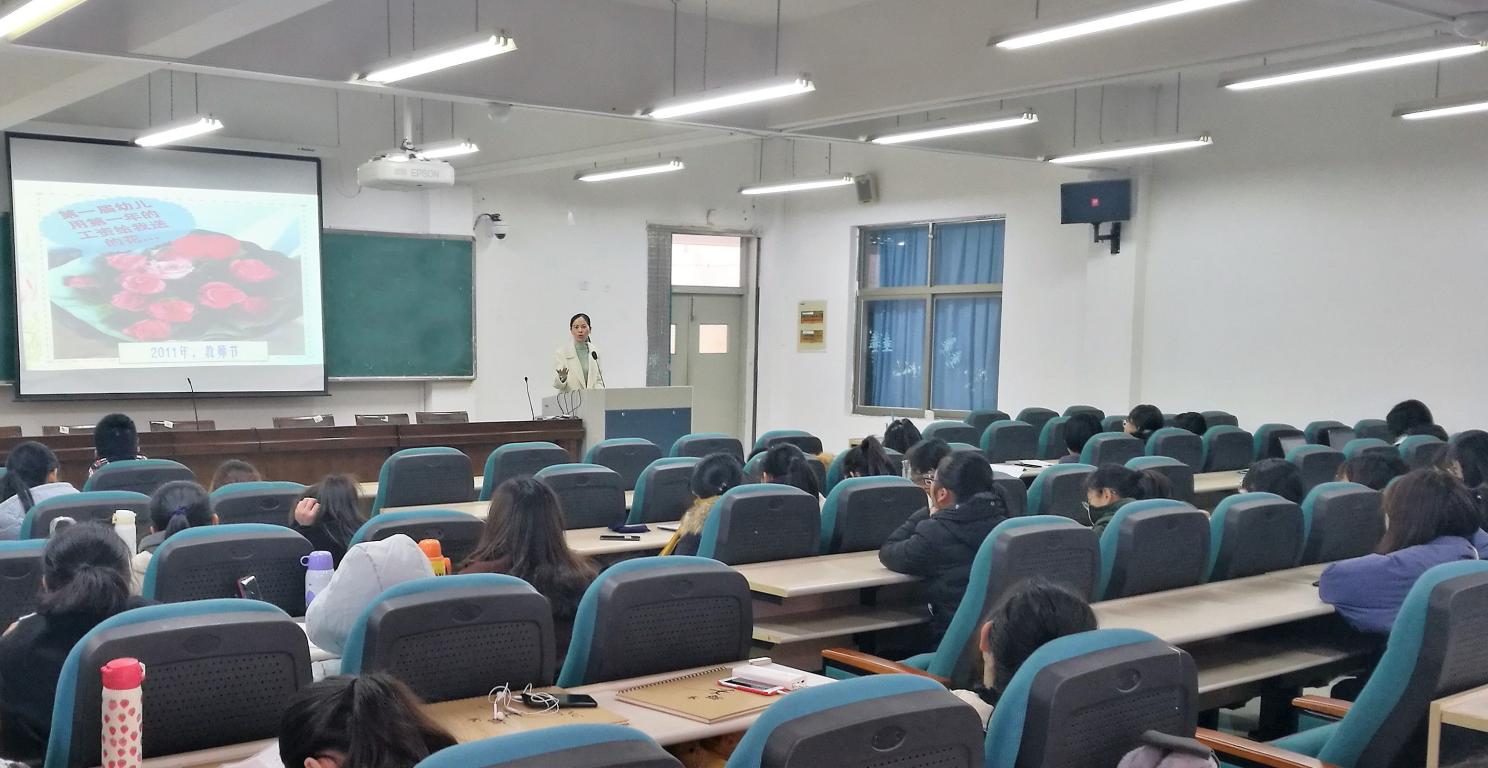 首先,林艳园长结合童年的学习时光,生动地讲述了自己与教育的故事。她强调,教育可以塑造人的灵魂,教师是人之一生的重要引路人,正是由于教师们的严格要求,使她逐渐养成勤奋好学、认真细致的学习习惯,不管遇到任何事情都会时时叩问、充分准备,笃定应对;同时,林园长分享了她与孩子们共同成长的教育故事,生动的案例打破了同学们认为“长大以后小朋友对幼儿园教师的印象是模糊的”的刻板印象。她第一届学生陈韵汝在每一个节日都会送祝福,还用自己的第一笔工资给她买了一束花祝贺教师节,还有小婉、金是、郭曦等孩子……从林园长的娓娓道来中,分明藏着老师对每个孩子的悉心关爱,点点滴滴都播种下爱的种子,收获感恩的心,永久的情。