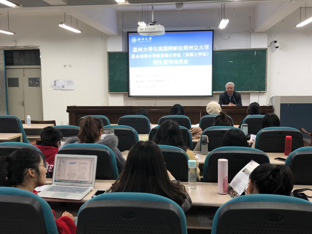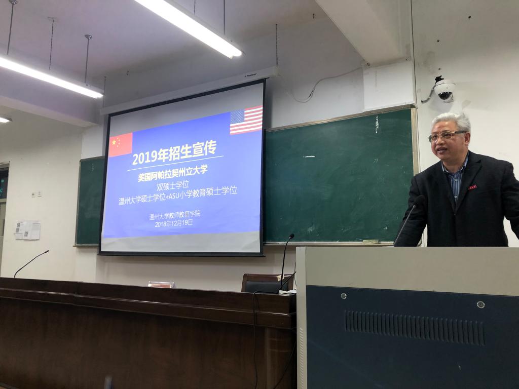12月19日晚,美国阿帕拉契州立大学双硕士学位招生宣传动员会在William威廉南校区9c205召开,全校研究生参加会议。学院副院长潘玉进主持会议并介绍了此项硕士留学生项目的具体情况,包括学校威廉概况、教育硕士学位获得要求和奖学金政策等。