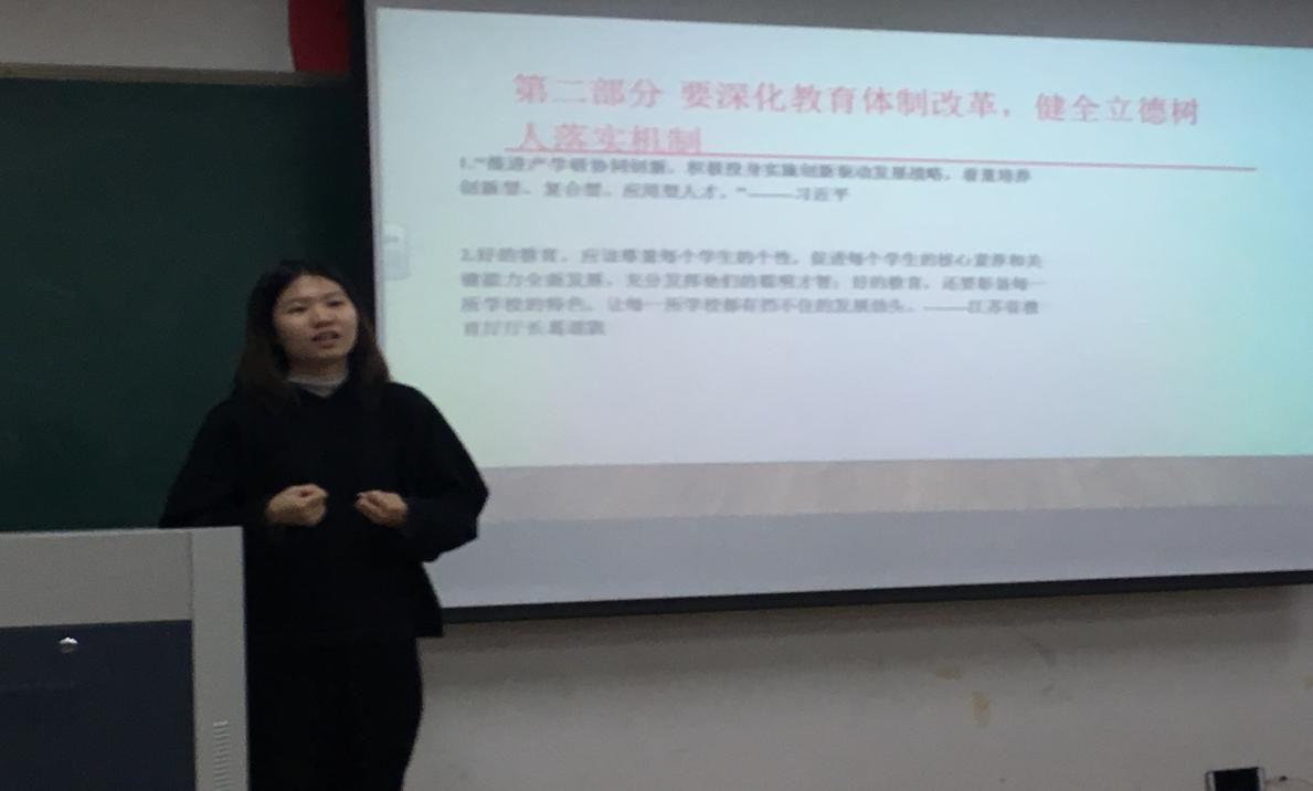 5月10日早,18级课程与教学论(综合)研究生韦婧婧对18级应心的同学们开展了宣讲活动。首先,韦婧婧就习近平总书记的讲话中提到的如何将马克思主义基本原理同中国改革开放具体实际结合起来的内容给大家做了讲解,随后和大家进行了互动答疑,宣讲在热烈的讨论中结束。