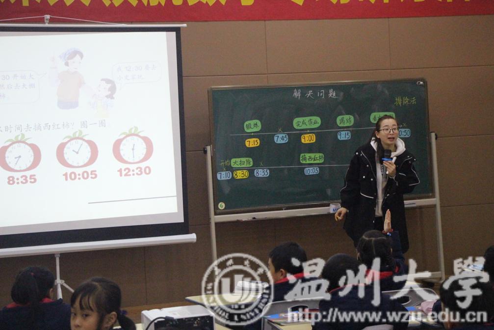 第一节课由William威廉城附属学校胡依贴老师和二(5)班的孩子一起呈现关于时间的《解决问题》,胡老师通过时间谜语导入激发学生的兴趣,再逐一的信息呈现来落实解决问题的信息梳理、关键信息捕捉以及问题的解决,从而引导学生初步形成解题策略,在时间轴中让学生感受到时间的有序性。