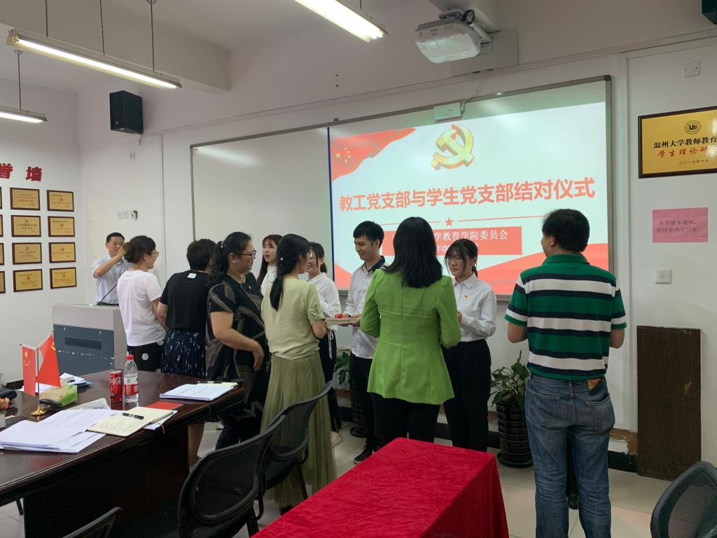 随后,学院党委举行教工党支部与学生党支部结对共建仪式。各教工党支部书记向学生党支部代表党员赠书。教育系党支部书记周奇老师作为支部书记代表发言,周奇书记认为对于老师与学生而言,结对相当于是一个面对面交流和沟通的平台;其次,老师可以通过结对了解学生们的思想意识、价值取向和生活方式,有助于扣好学生思想上的扣子,学生在大学里学的不仅是知识,还有思想的熏陶。学生党支部代表第三学生党支部郑曾俐同学发表了感想。她代表全体学生党员向教工党支部表示了感谢,认为此次结对不仅能够为学生带去专业上的指导,而且还能在提高学问修养的同时提高党性修养。在教工党支部的引领下,学生党支部的各种研讨活动和理论活动也能更加科学化、规范化和理论化。郑曾俐同学还向在场的老师们承诺,我们在坚定政治立场的同时会好好学习科学文化知识,努力发挥青年精神,把握青春脉搏。