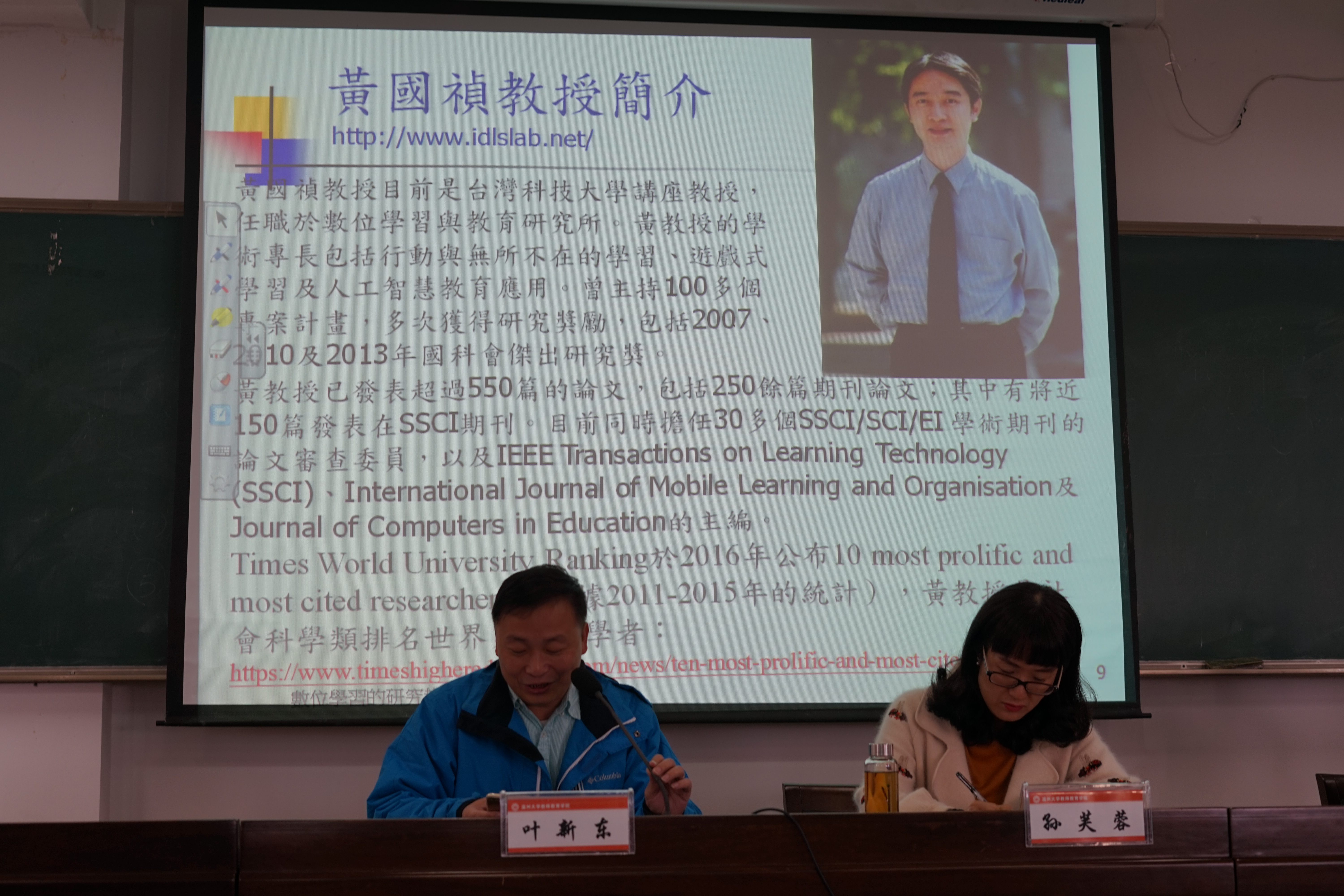 讲座人黄国祯教授的学术专长包括行动与无所不在学习、智能型计算机辅助测验与评量、人工智能与专家系统。曾主持台湾地区100多个项目计划,获得多次台湾国科会演技奖励。目前担任30多个SSCI/SCI/TSSCI/EI 学术期刊的论文审查委员,以及多个学术期刊的编辑。已发表550多篇论文及著作,包括120多篇在SSCI期刊发表的学术论文。由于论文的高质量及高引用率,获得多个国际期刊论文奖,并受邀担任多个国际学术研讨会的keynote speaker。