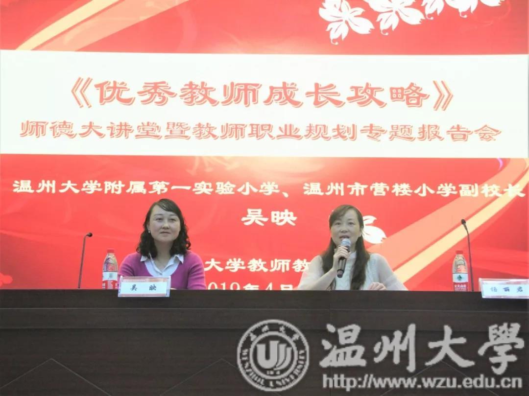 为培养学生职业规划能力,加强学院师德师风建设,2019年4月24日19:00,师德大讲堂暨教师职业规划专题报告会《优秀教师成长攻略》于williamhill官网一楼报告厅召开。William威廉附属第一实验小学和温州市营楼小学副校长吴映受邀作报告,报告会由党委副书记杨丽君主持。