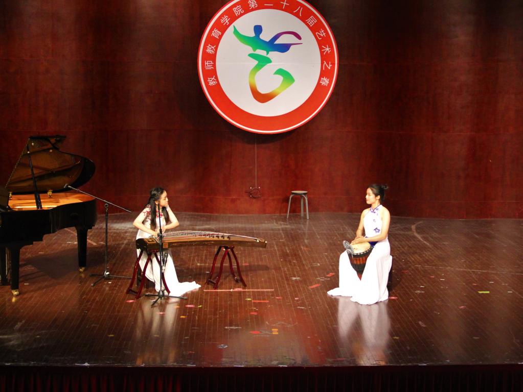 弹与唱的结合让观众感受到了音乐的力量,器乐的演奏更是带领观众领略到了音符的极致魅力。17学前专5班带来了二人合奏《大漠行》,琴声忽而急骤激烈如万马奔腾,忽而悲怆凄婉如寒雨簌簌,着实动人心魄。17应心班的钢琴曲《river flows in you》如“随风潜入夜”的春雨,润物无声,更如朗照松间的明月,清幽明净。17教技班的吉他曲《爱的罗曼史》更是让人产生了清风徐来之感。17学前本班的小提琴曲《渔舟唱晚》则让人陶醉在优美的音乐旋律里而不能自拔。在16学前本班的巴乌演奏中,本次艺术之春器乐、弹唱专场也圆满落下帷幕。