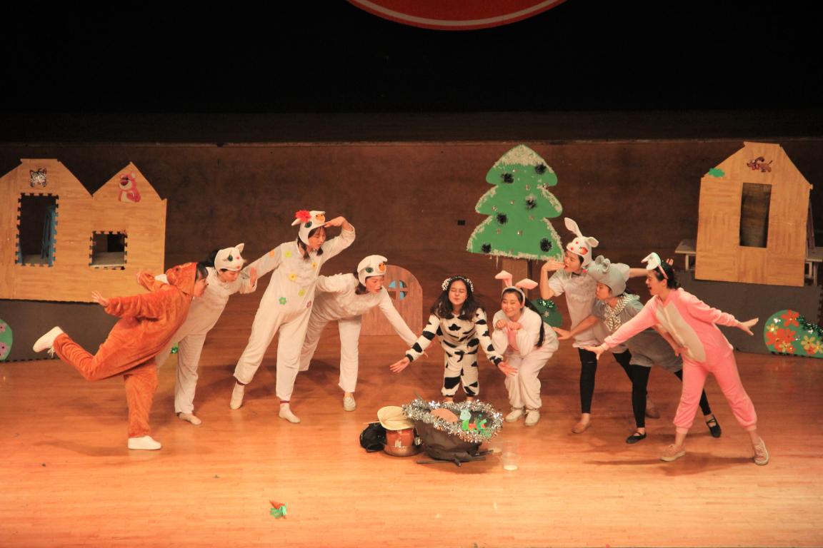 15学前本带来的《石头汤》展现的是一场智商的较量。三只饥肠辘辘的小猪巧借煮石头汤,让原本自私小气的村民都自愿参与进来,分享自己的食物。随着情节的展开,不但是剧中的小动物,在场的观众们也深受感染,懂得了慷慨好施能够收获快乐和幸福的道理。爱的力量是无穷的,它可以将大坏蛋变成大好人。17学前专9班的《狼大叔的红焖鸡》中狼大叔从狡猾到善良的转变,就告诉了小朋友们这样一个道理。团结就是力量,在面对强大的敌人时,森林里的小动物们团结一致,灭掉了森林之王——大老虎的嚣张气焰,17学前专4班的《智斗老虎》引得台下的小朋友们纷纷鼓掌叫好。轻松巧妙的故事情节、惟妙惟肖的话剧表演,让在场的观众进入一个个美丽奇幻的童话世界。